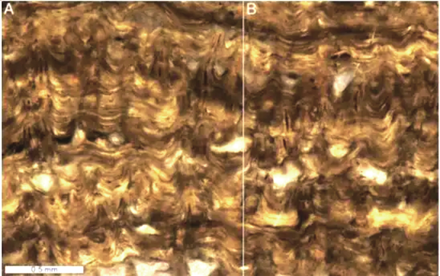 嫘祖冠毛层孔海绵化石纵切面。 中国科学院南京地质古生物研究所供图。据新华社