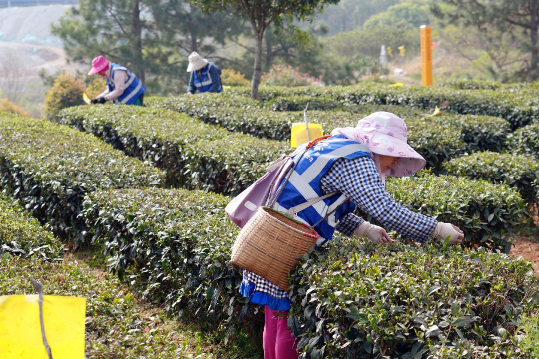在周巷镇荣华村的茶叶种植基地,一行行茶树抽芽吐绿,三五成群的采茶工挎着竹篓,穿梭于翠绿的茶树间,忙着抢摘春茶,茶场遍地一片繁忙景象。
