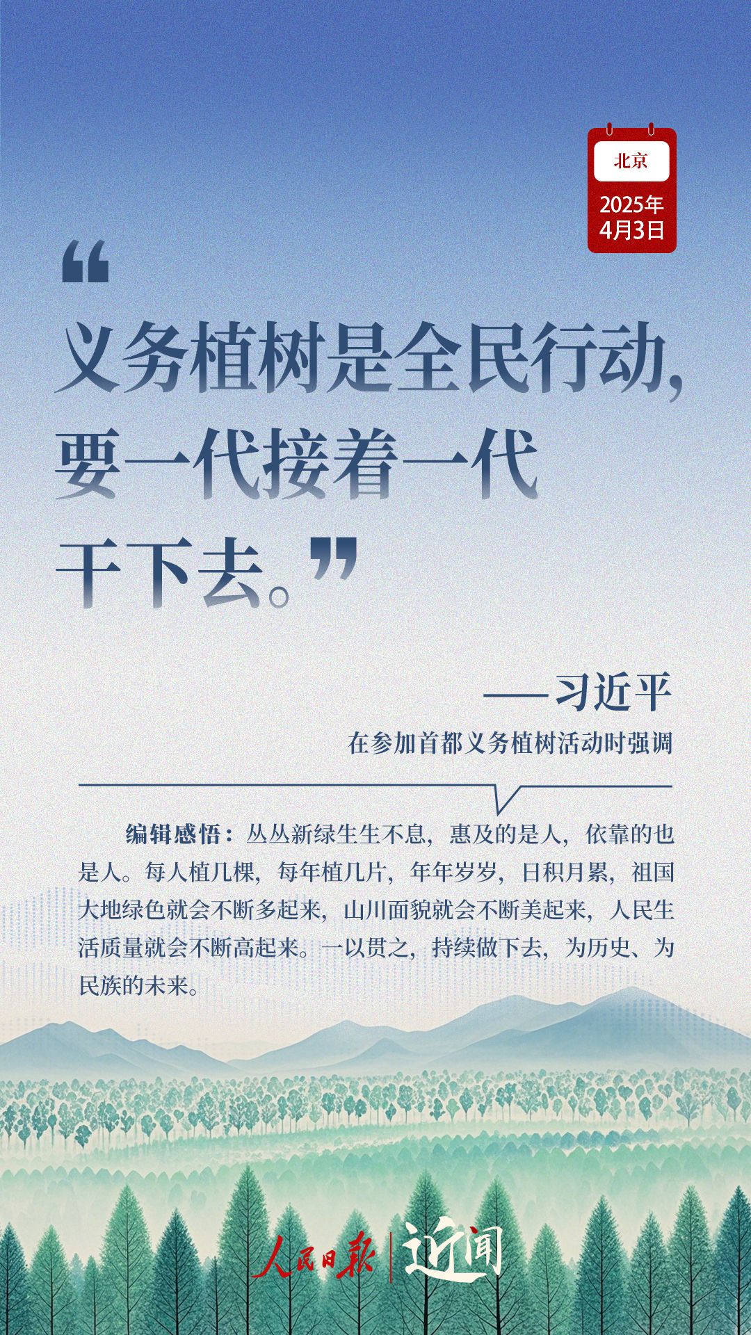 “生态环境持续改善,人民群众感受最直接最真切。”“义务植树是全民行动,要一代接着一代干下去。”在植树现场,从这些话语读懂一份坚持、一种情怀。