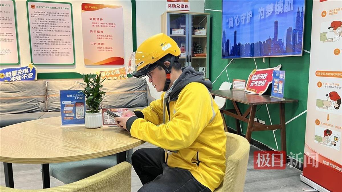外卖骑手林先生在中南路铁塔骑手之家工会驿站休息