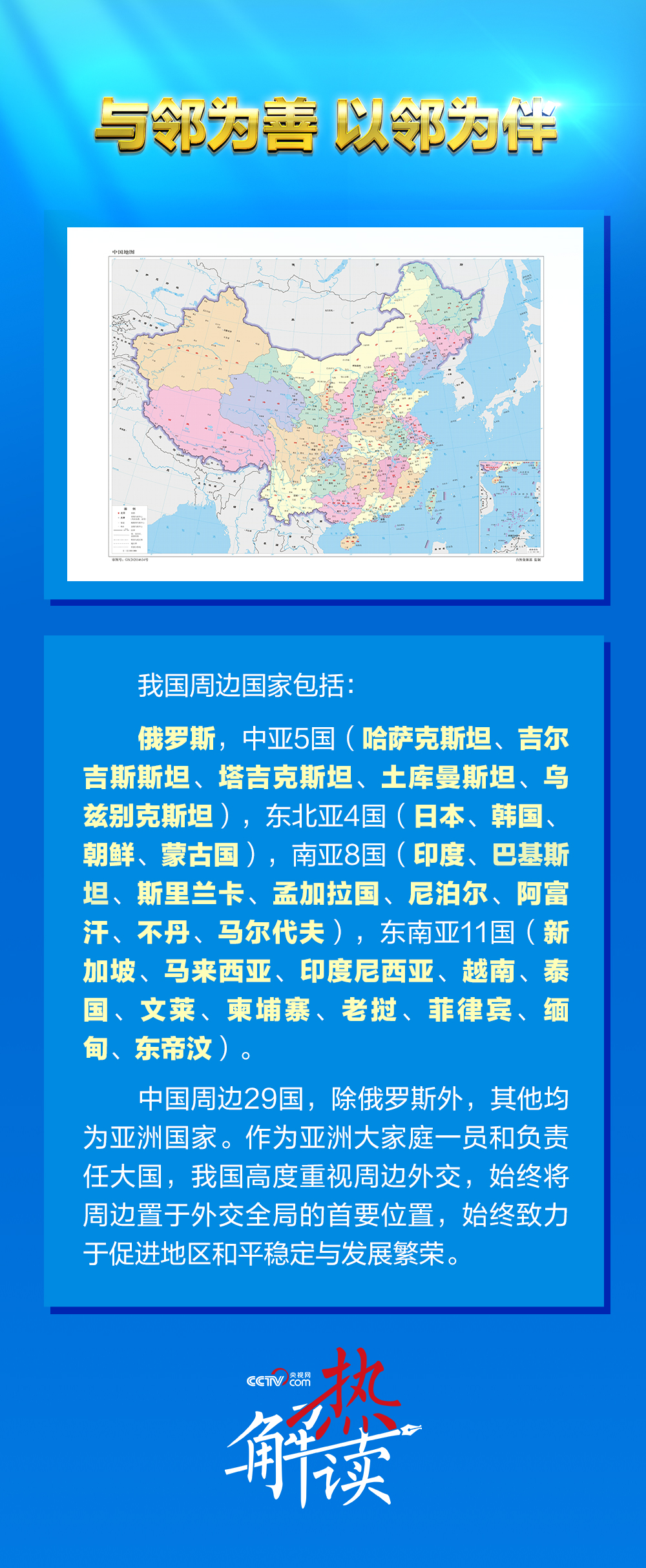 中国与周边国家山水相连,人文相通,利益相融,命运与共。周边国家在我国统筹国内国际两个大局、发展和安全两件大事中扮演着至关重要的角色。