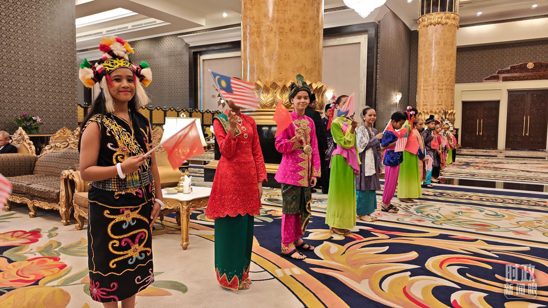 △欢迎宴会厅外身着民族服装的少年儿童。(总台央视记者闫耀东拍摄)