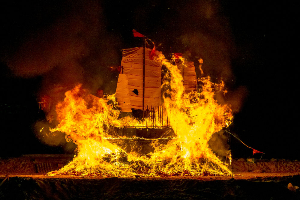 送王船是广泛流传于我国闽南地区和马来西亚马六甲沿海地区禳灾祈安的民俗活动。2020年,中国与马来西亚联合申报的“送王船——有关人与海洋可持续联系的仪式及相关实践”项目,被列入联合国教科文组织人类非物质文化遗产代表作名录。这是2020年11月16日,在马来西亚马六甲,人们点燃“国安号”王船。
