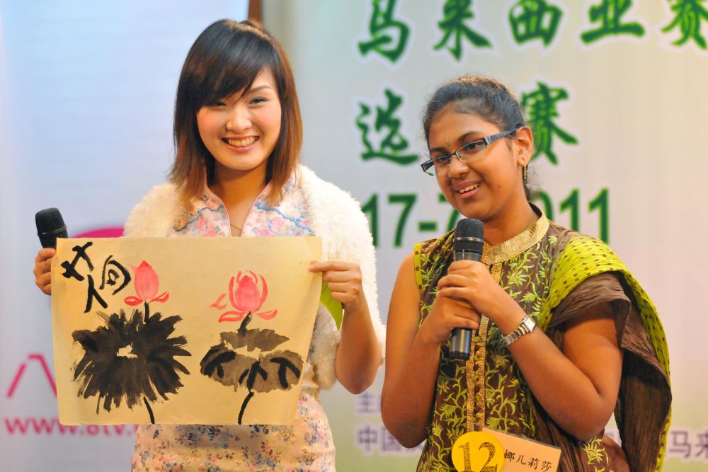 2011年7月17日,参加世界中学生中文比赛马来西亚赛区比赛的选手马雅司(左)展示自己创作的水墨画。