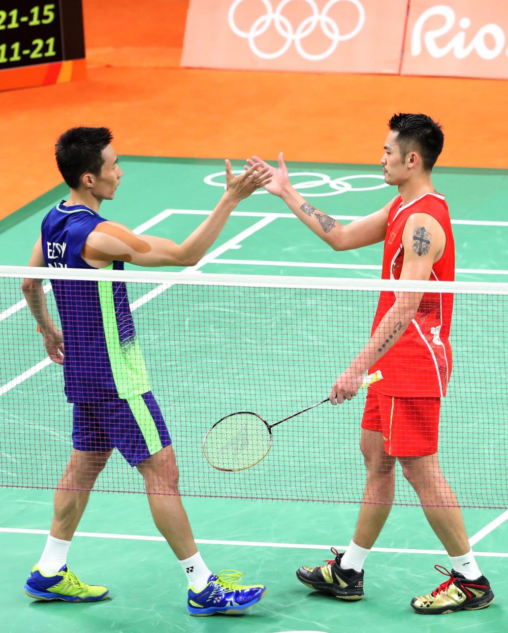 2016年8月19日,里约奥运会羽毛球男子单打半决赛后,马来西亚选手李宗伟(左)和中国选手林丹握手致意。