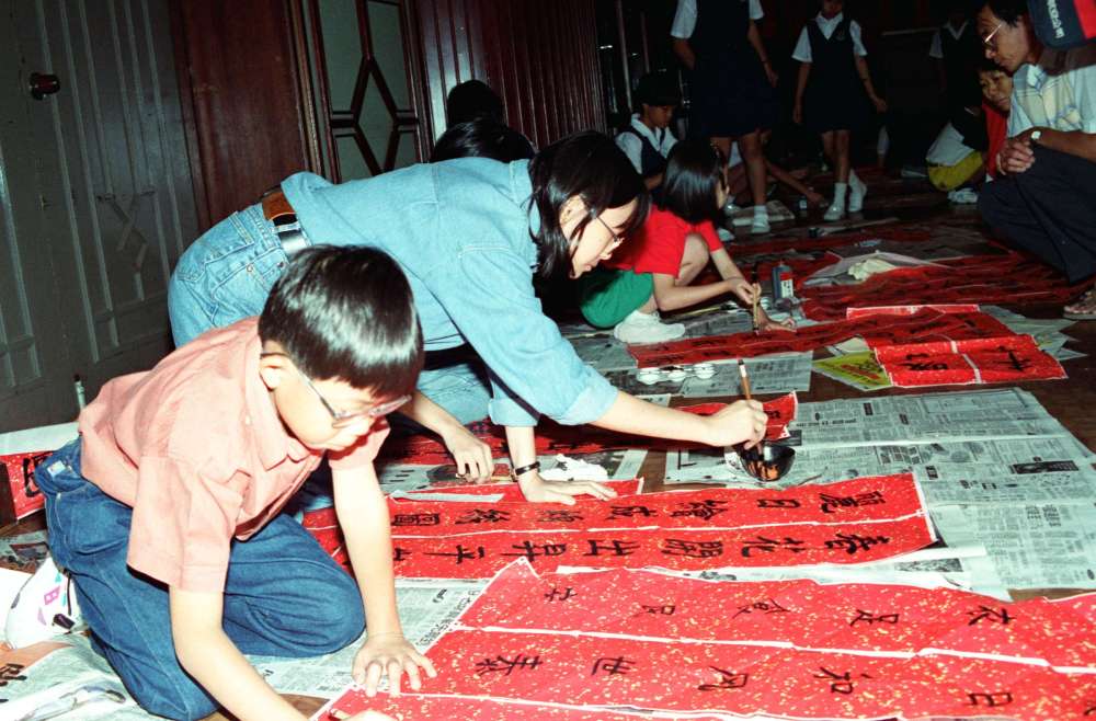 1995年,马来西亚小书法爱好者挥笔献技,书写汉语条幅。