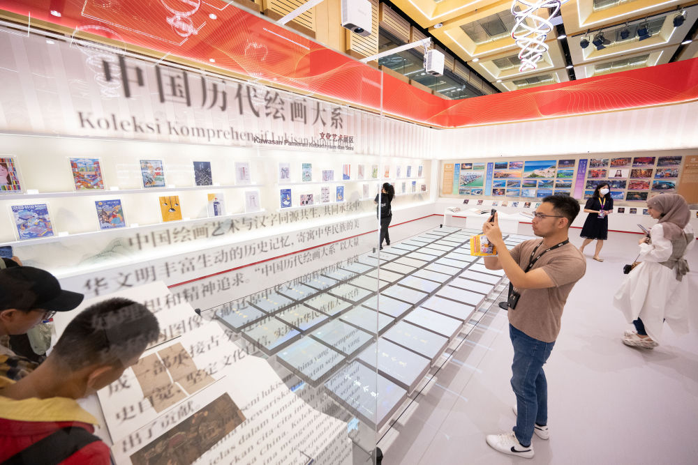 2023年5月26日,观众在马来西亚吉隆坡举行的第40届吉隆坡国际书展上观看“中国历代绘画大系”展览。由浙江大学、浙江省文物局编纂,浙江大学出版社出版的“中国历代绘画大系”,收录了海内外263家文博机构的纸、绢(含帛、绫)、麻等材质的中国古代绘画藏品12000余件(套),涵盖了绝大部分传世的“国宝”级绘画珍品。