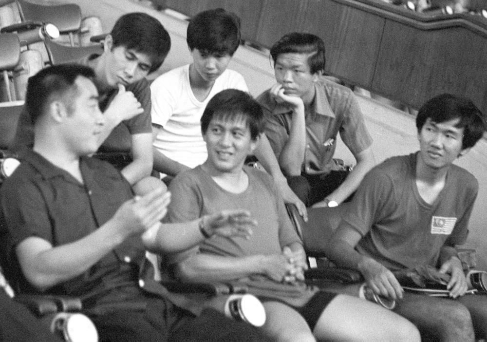 1973年,中国乒乓球代表团应马来西亚乒乓球总会的邀请,对马来西亚进行了友好访问,受到马来西亚人民的热烈欢迎。这是1973年6月11日,中国乒乓球代表团团长庄则栋(左一)同马来西亚乒乓球运动员一起交流球技。