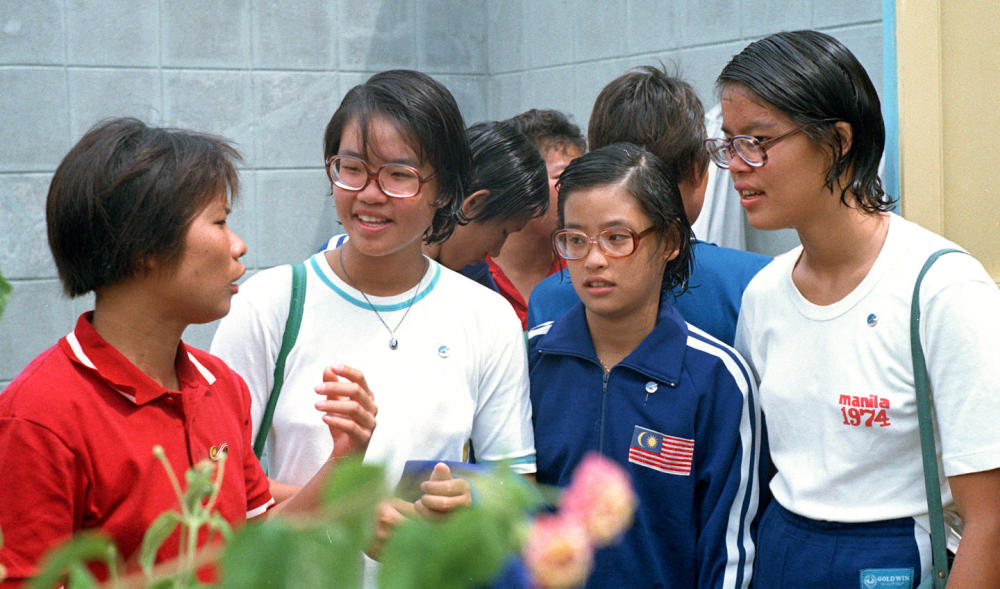 1975年8月2日至8月10日,北京国际游泳、跳水友好邀请赛举行。一同参加这次邀请赛的马来西亚游泳三姐妹林宝龄(前右二)、林爱龄(前右一)、林勇龄(左二)和中国运动员叶玩嫦亲切交谈。