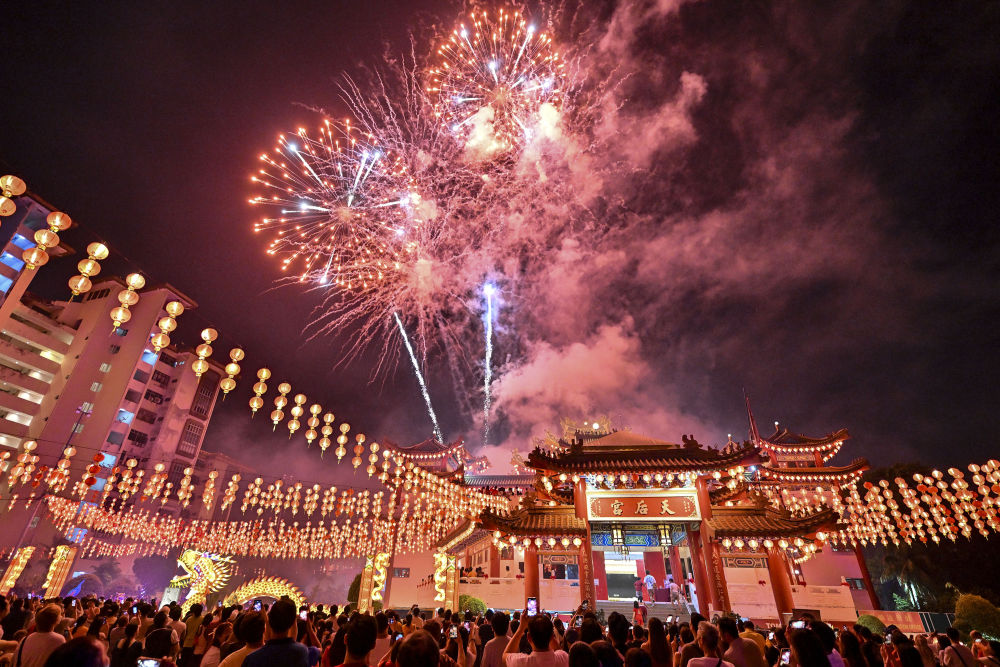 2024年2月24日,马来西亚首都吉隆坡天后宫的烟花表演,吸引众多市民到场一同庆祝元宵佳节。