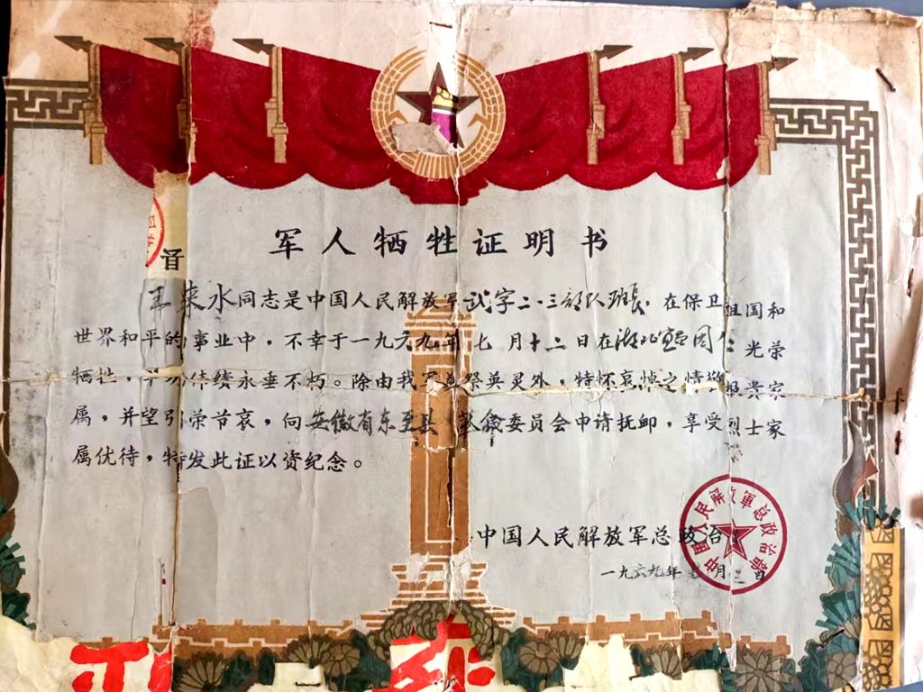 据了解,1965年,王来水烈士在原宜昌县黄花新坪大队715厂任警卫班班长。王双喜出生仅8天,王来水便归队,此后3年多未能回家。1969年7月12日,在一次训练途中,王来水突遇洪水,不幸牺牲,留下妻子和一个不满4岁的儿子。