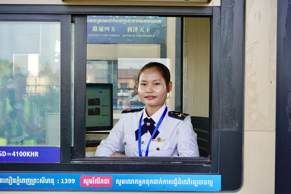 金港高速一处收费站里,工作人员为往来车辆提供服务。(柬埔寨金港高速公路有限公司供图)