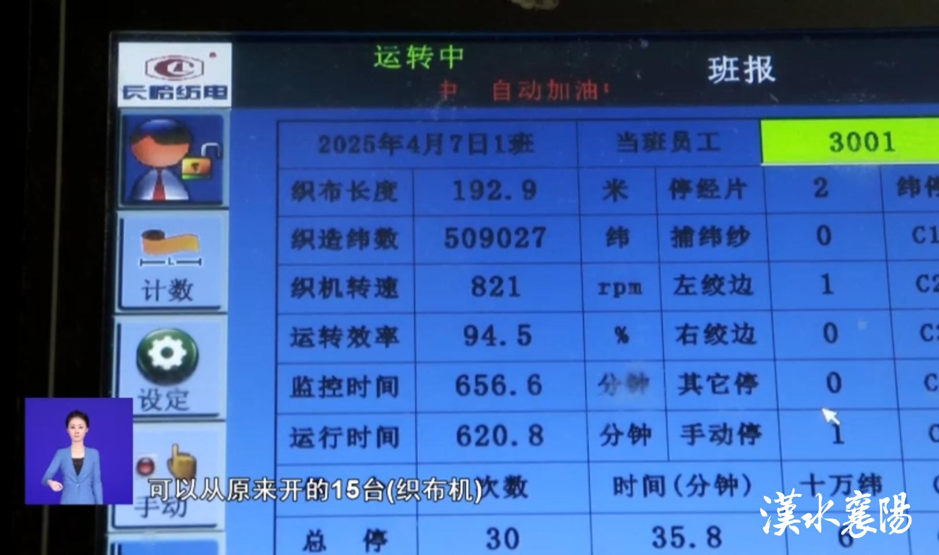 湖北金恒昌纺织有限公司一车间潘耀萍说:“织布机都安装了电子显示屏,上面能够直接显示经停未停,还有车速。这样的话我们一个挡车工可以从原来开的15台(织布机),增加到现在的19台(织布机)。”