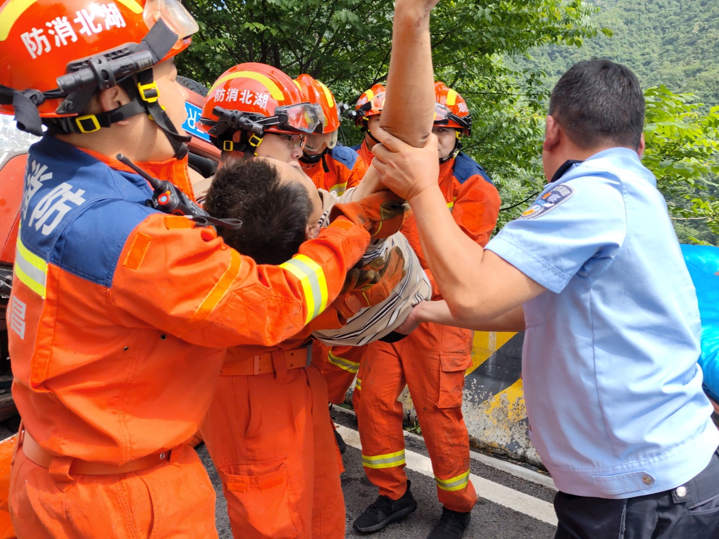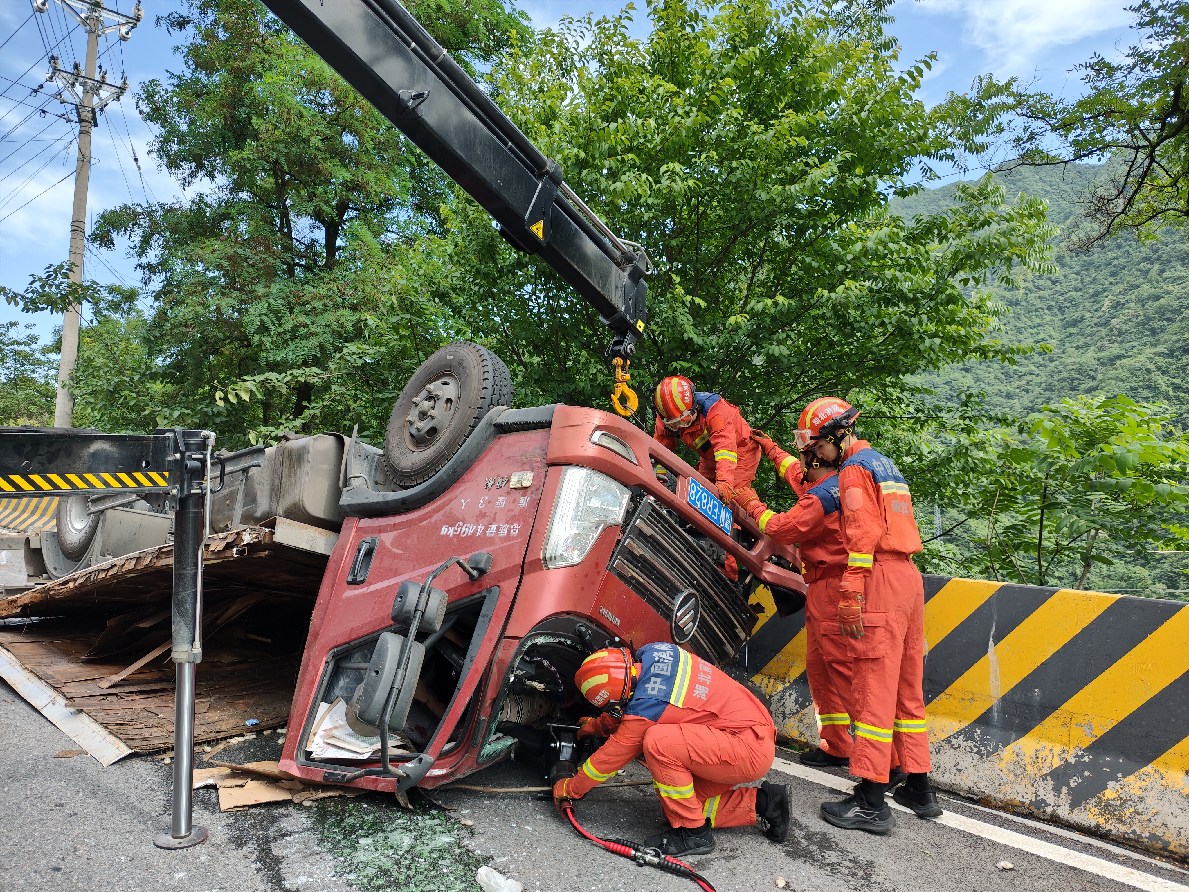 消防指战员抵达现场了解到,事故现场是长下坡急弯路段,事故原因是司机驾驶时分心,速度过快导致车辆失控,车身严重变形,被困人员腿部也被变形的驾驶室卡死,无法脱困。指战员迅速使用液压破拆工具组对车门进行破拆,并对驾驶室内部进行撑顶,扩大了救援空间,方便进入车内救援。经过30分钟的紧张救援,被困人员被成功救出,随后交给现场医护人员。