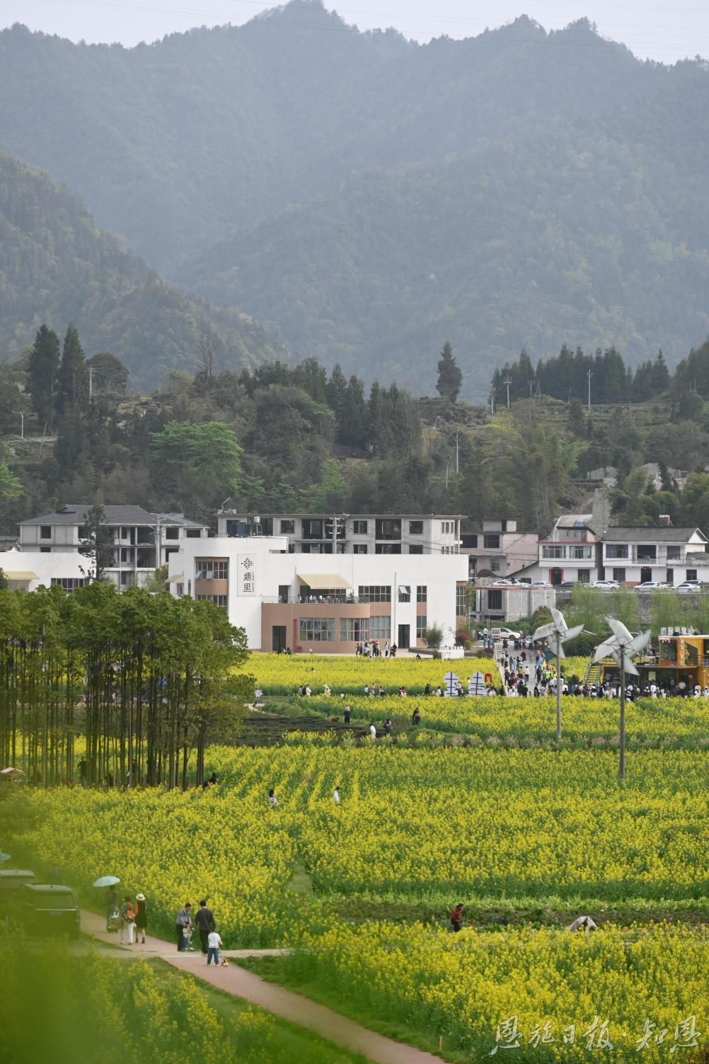 4月5日,恩施市白果乡下村坝村“塘里堂外”乡村旅游综合体近200亩油菜花竞相开放,与青山绿水、古朴村舍相互交融,构成一幅多彩的田园画卷,吸引众多游客前来。