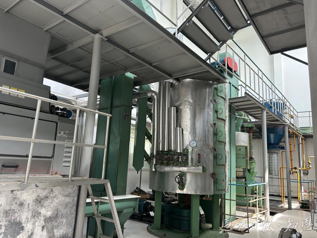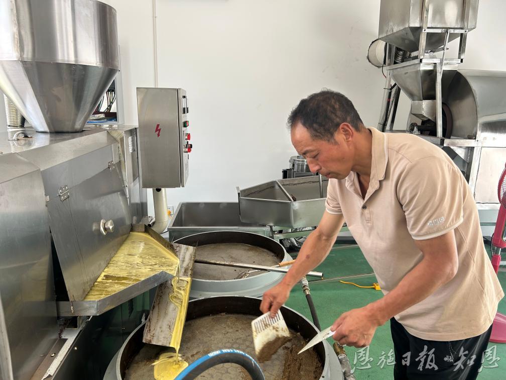 2025年6月16日,容华食品工人周元吉在半自动生产线上,为村民加工菜籽油。