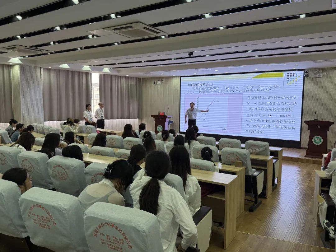 随后,三峡大学经济与管理学院戚教授立足学术前沿,以“现代投资组合理论”为核心,系统讲授风险资产与无风险资产的配置逻辑,强调坚持理性投资、长期投资、价值投资的重要性,并提醒同学们:“警惕‘高收益低风险’的伪命题。”