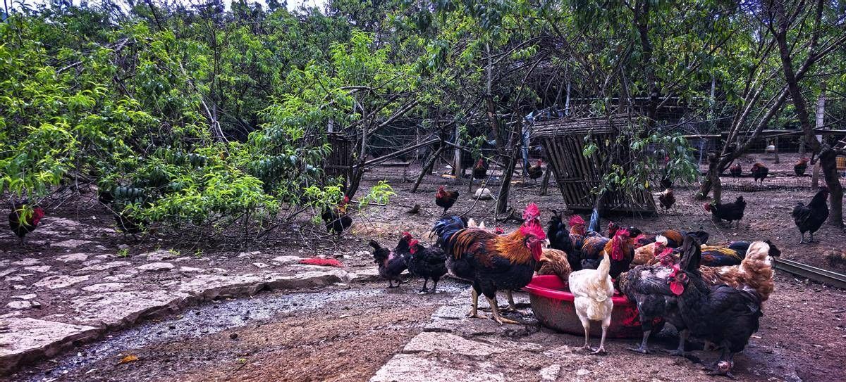 德溢民黄桃园种植基地林下养殖“跑步鸡”
