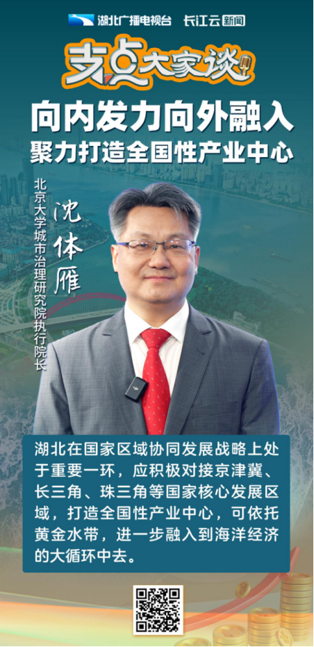 沈体雁:湖北具有人才优势、交通优势、制造成本优势、良好水土资源优势,是国家区域协同发展战略的重要一环和关键支点,湖北应抓住机遇,发挥优势,联动中部六省,积极对接京津冀、长三角、珠三角等国家核心发展区域,打造全国性产业创新中心,包括中国AI应用产业创新中心、新型研发产业创新中心、总成本领先的先进制造业创新中心、高效能智慧物流产业创新中心和近海型海洋产业创新中心等产业创新中心。
