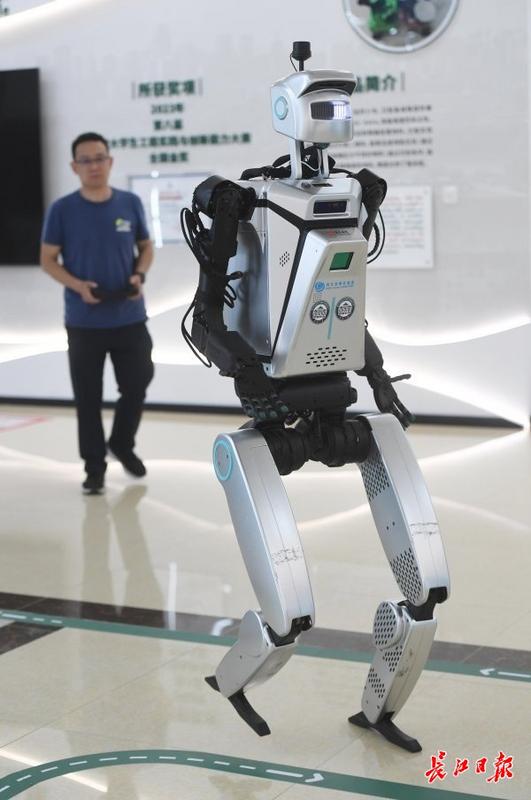 7月11日,武汉大学创客工场展厅,“小天”机器人在科研人员操控下稳健行走。 长江日报记者高勇 摄