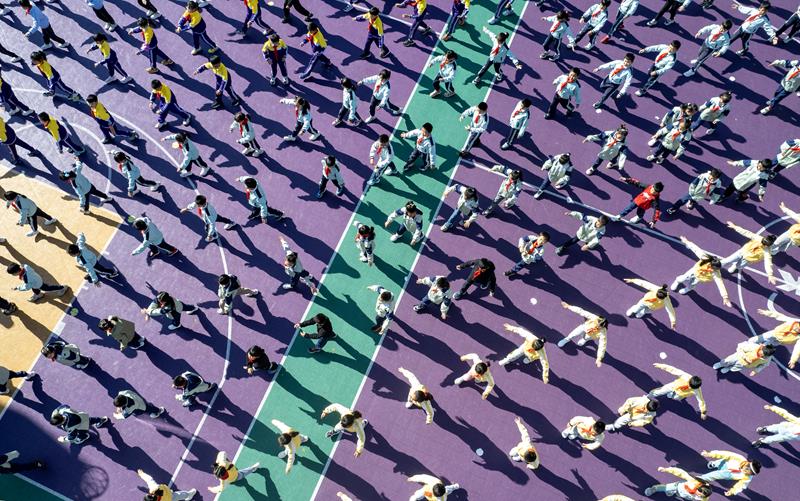 △2025年2月28日,云南昆明金康园小学学生在操场上做课间操。