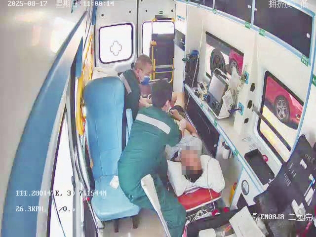 宜昌市第二人民医院救护车上,医护人员正在为电击伤男子开展急救。 监控截图