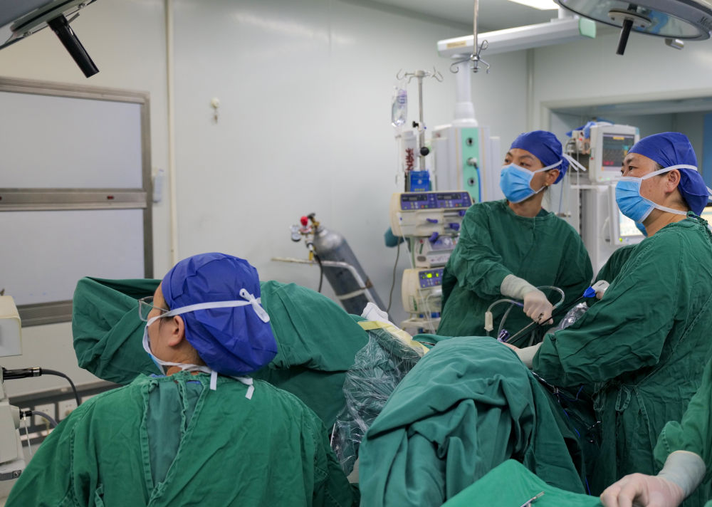 2025年8月4日,北京大学人民医院第十批援藏妇科医生张果(中)与西藏自治区人民医院医生李芳(左)一起为患者做手术。新华社发(柑丹鸯琦摄)