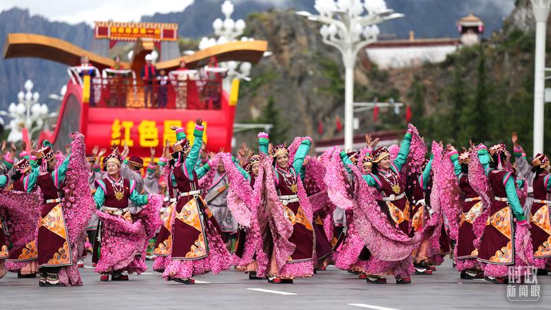 六十载栉风沐雨,一甲子沧海桑田。格桑花海群舞中,悠扬的扎念琴声响起,雄浑的甲谐舞、琼结卓舞、弦子舞、锅庄舞、普兰宣舞应接不暇,舞出西藏繁荣发展的精气神。身穿工布服饰、飞天服饰等藏族特有服饰的游行群众,以一场非物质文化遗产的盛宴向西藏自治区成立60周年献礼。