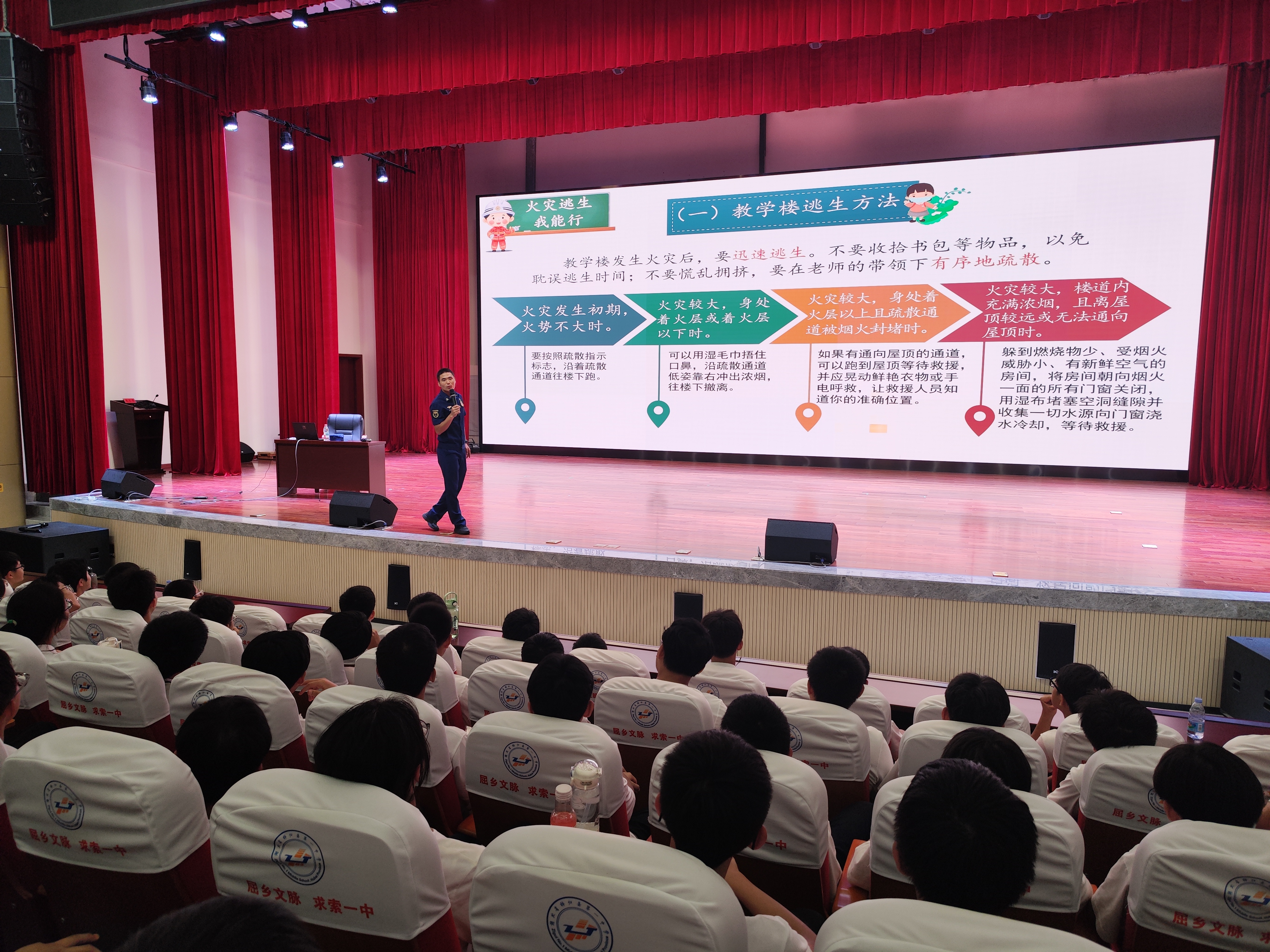 “同学们,熟悉校园的每一个安全出口,就像记住教室的位置一样重要!”活动伊始,消防宣传员借助科普视频和 PPT课件,为在场学生讲解了火灾预防、疏散逃生等安全知识,着重强调了新生进入校园后,要第一时间熟悉各个场所的安全出口和疏散通道位置,爱护公共消防设施器材,发现火灾隐患及时上报。随后,一场紧张有序的应急疏散演练迅速展开。随着警报声响起,全体师生瞬间“切换”至应急状态,在消防员与老师的引导下,弯腰低姿、捂住口鼻,迅速沿着预定疏散路线撤离,仅用时3分15秒,所有学生全部安全撤离到室外操场。