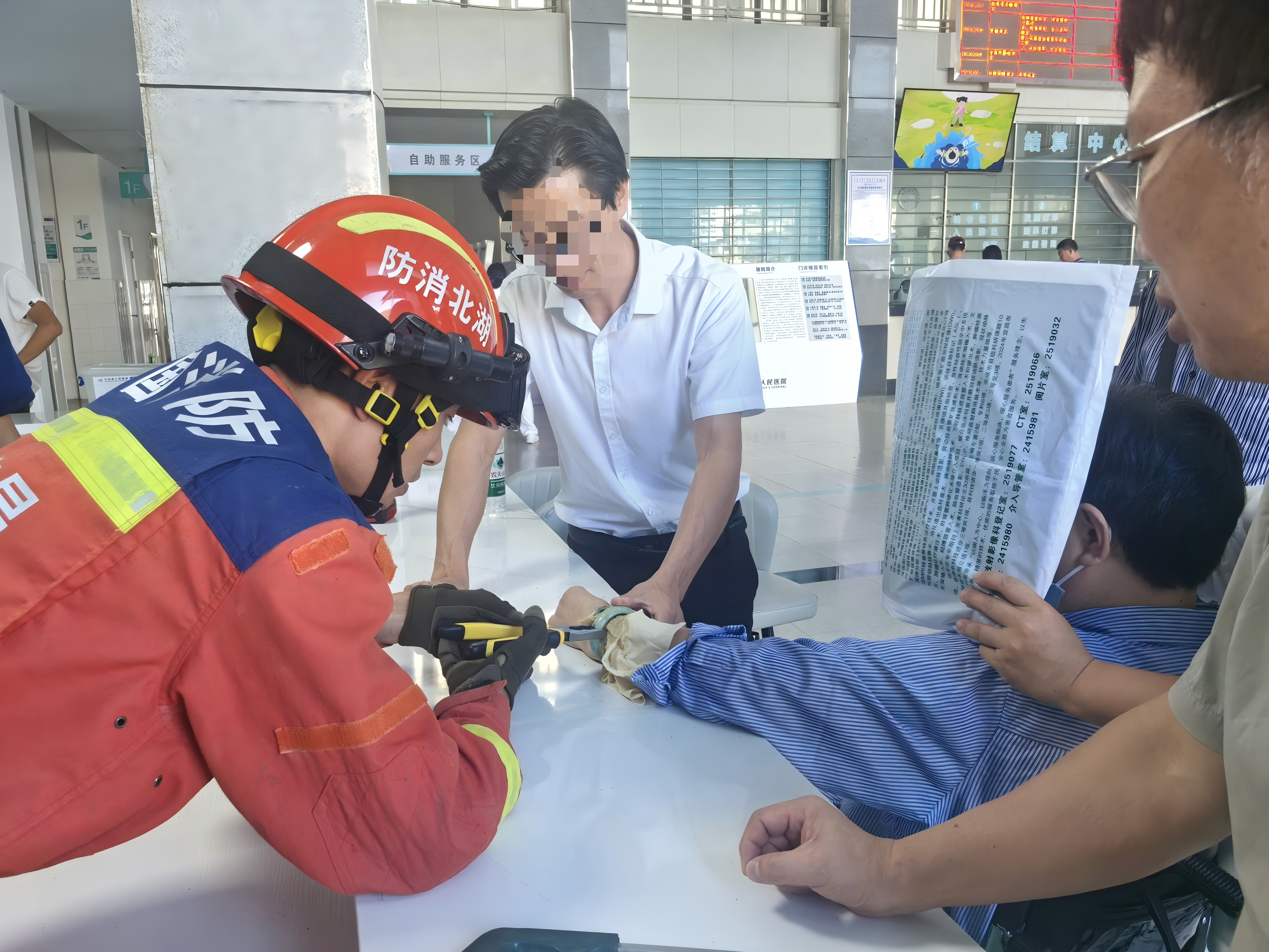 8月26日,兴山县有一病人因手镯卡手难以取下,急需帮助。兴山县消防救援大队接到求助电话后,立即出动赶往医院。