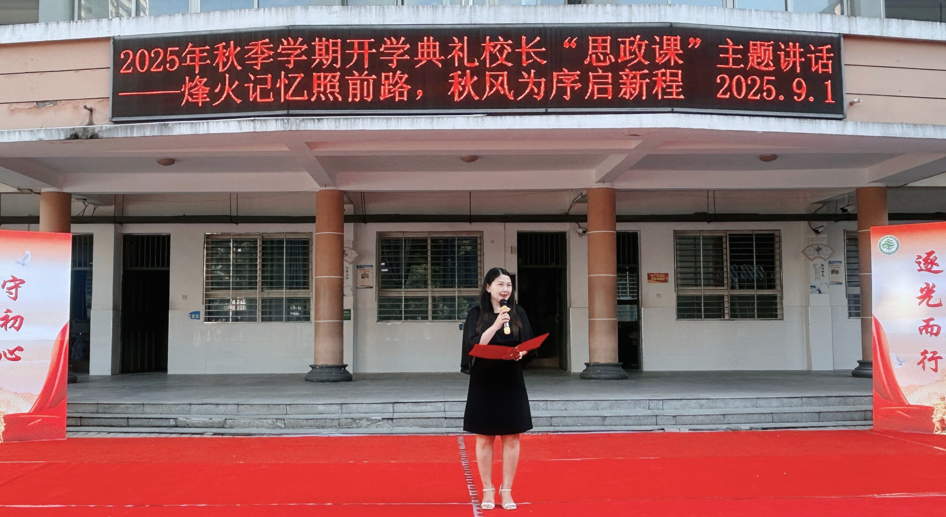 升旗仪式后,该校党支部书记、校长冯亮在致辞中,向师生送上新学期祝福并欢迎七年级新生。她回顾了学校在科创、体育、艺术等领域的成果,介绍了学校成为“宜昌市教科院教联体实验学校”及新操场建设筹备的利好消息;同时结合抗战胜利80周年,冯亮校长强调铭记历史是开创未来的根基,并对师生提出厚植家国情怀、锤炼强健体魄、坚持积累提升的三点期望。