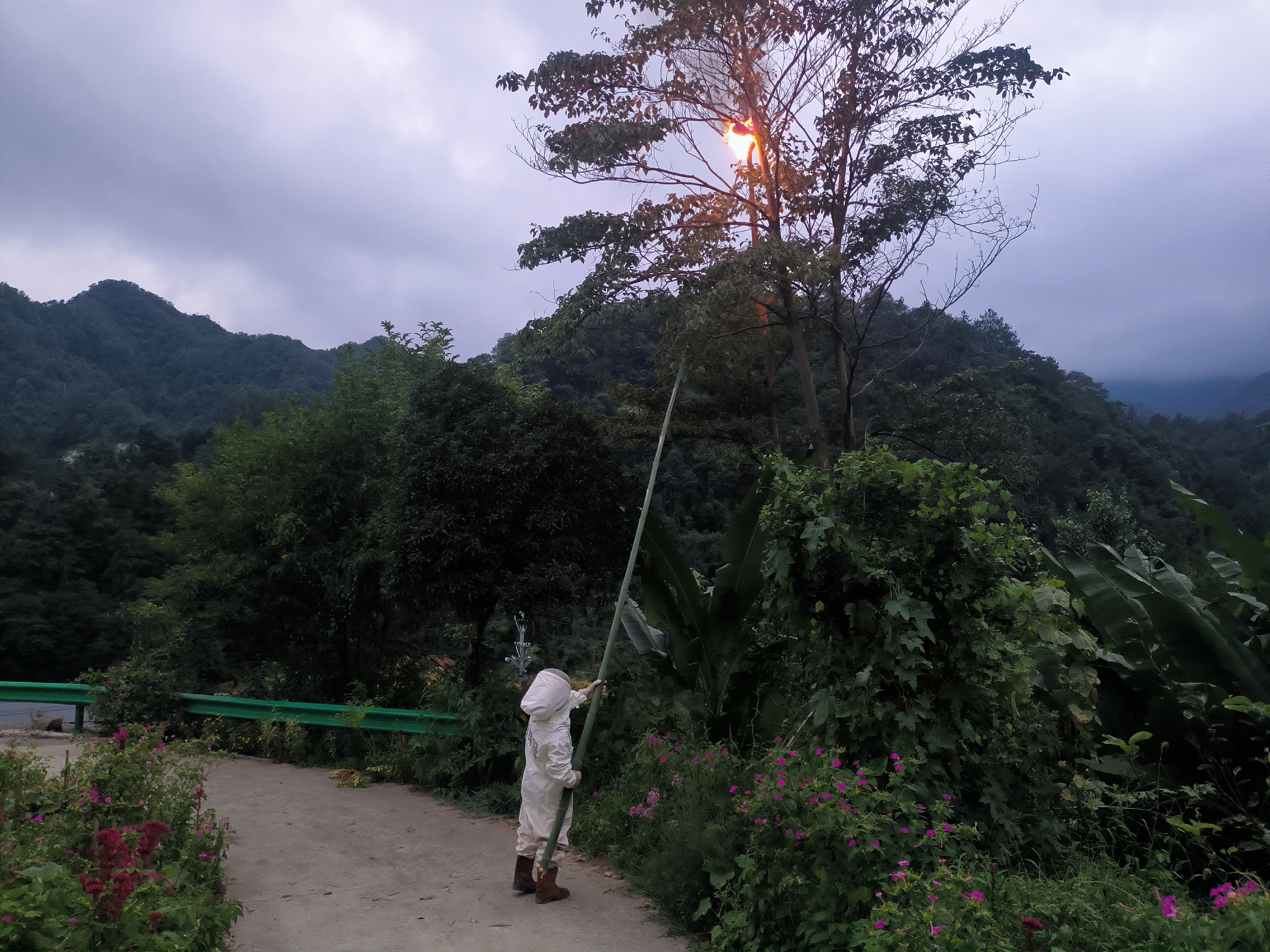 经现场勘察,马蜂窝高悬树梢。消防员穿着防蜂服,利用火把精准覆盖蜂巢,大量马蜂在烈焰中被瞬间焚毁,残余蜂群被同步药剂喷杀。