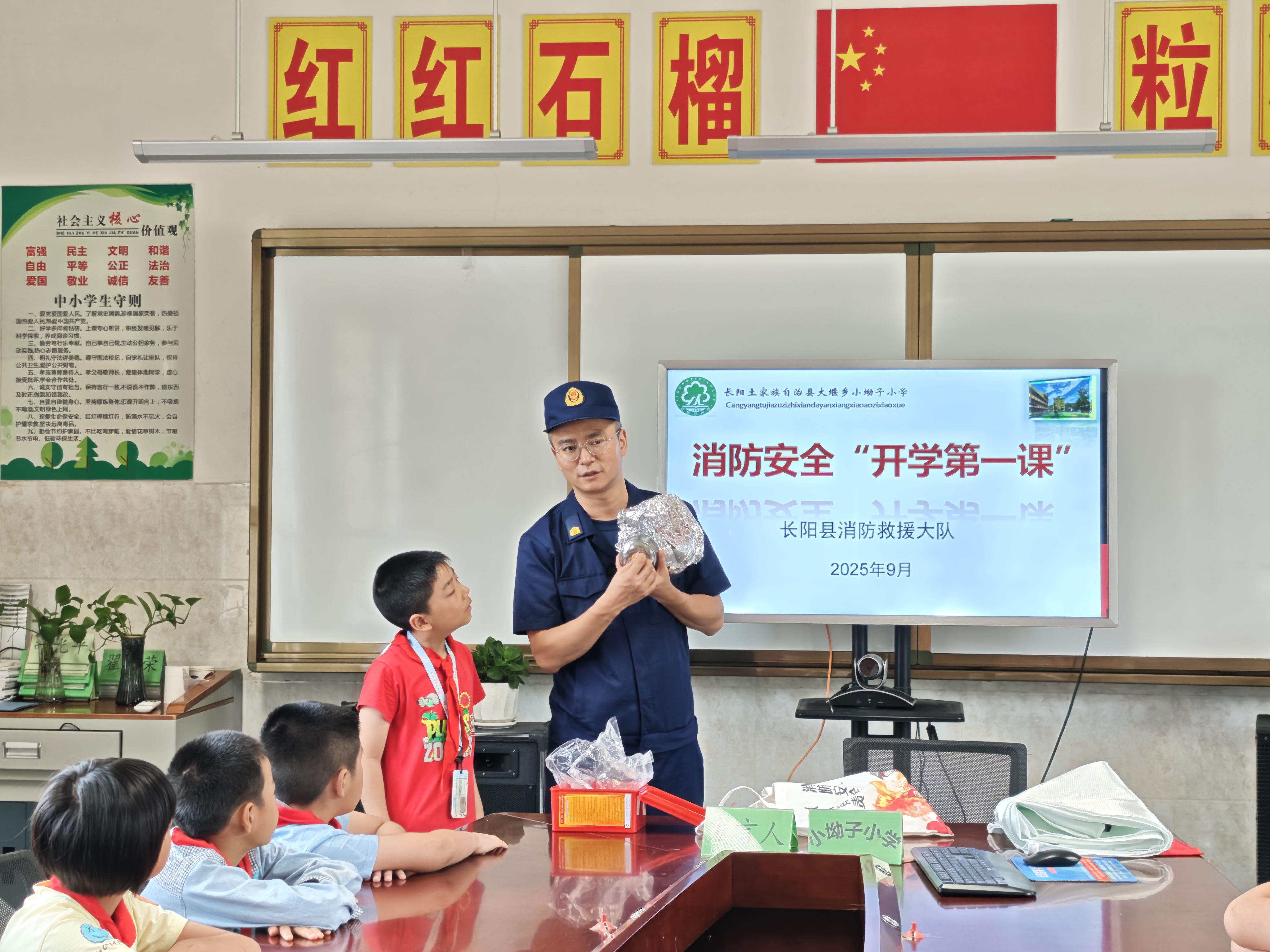 小坳子小学地处长阳土家族自治县偏远山区,学校规模较小,年级体系也不完整。在这堂特殊的消防安全课上,消防宣传员结合校园和家庭生活场景,生动讲解了日常防火知识,重点指导学生如何安全用电、用火、用气,避免火灾发生。针对校园火灾特点,宣传员还特别强调了教室、宿舍等场所的防火要点,让师生们对消防安全有了更直观的认识。