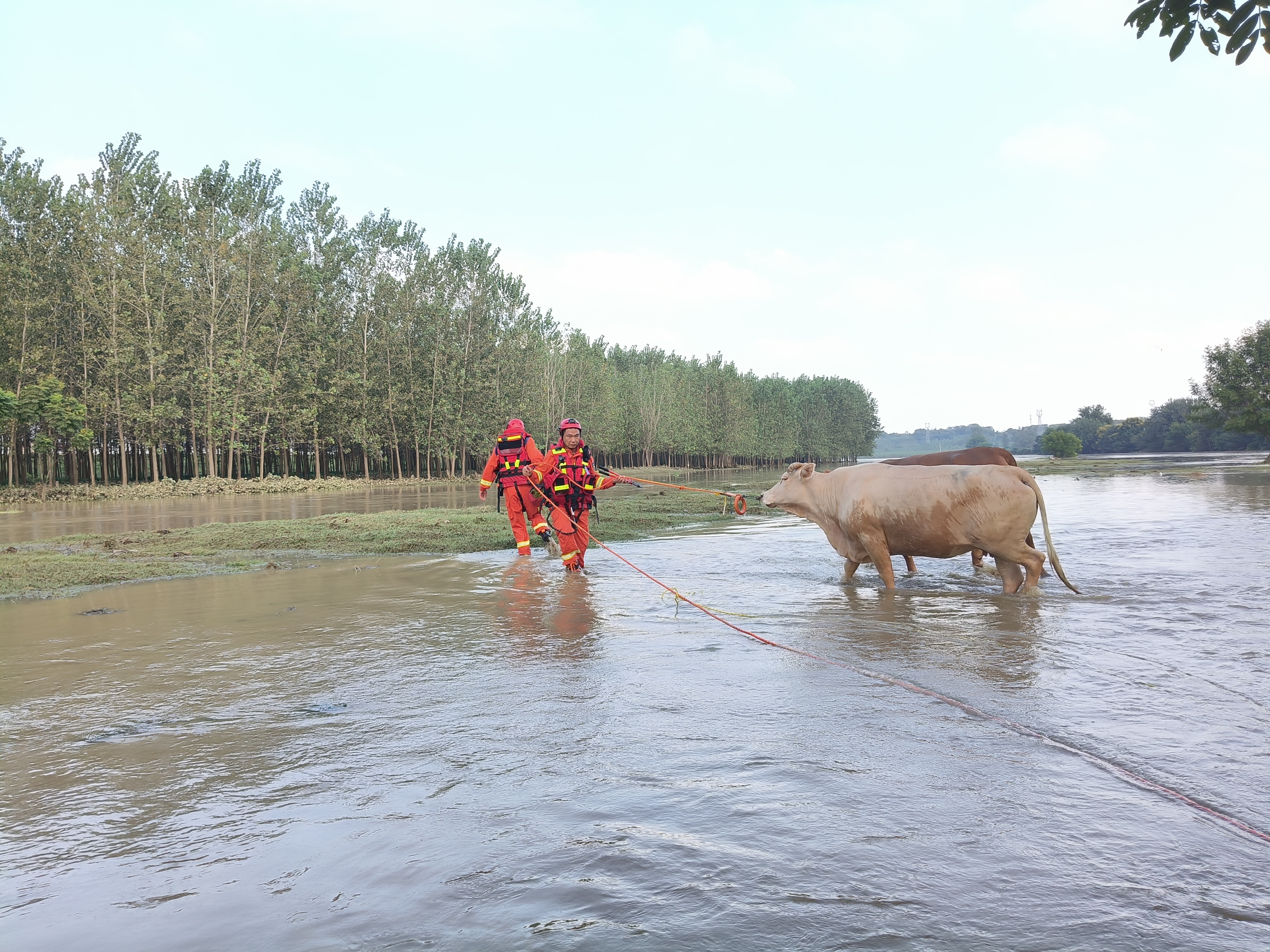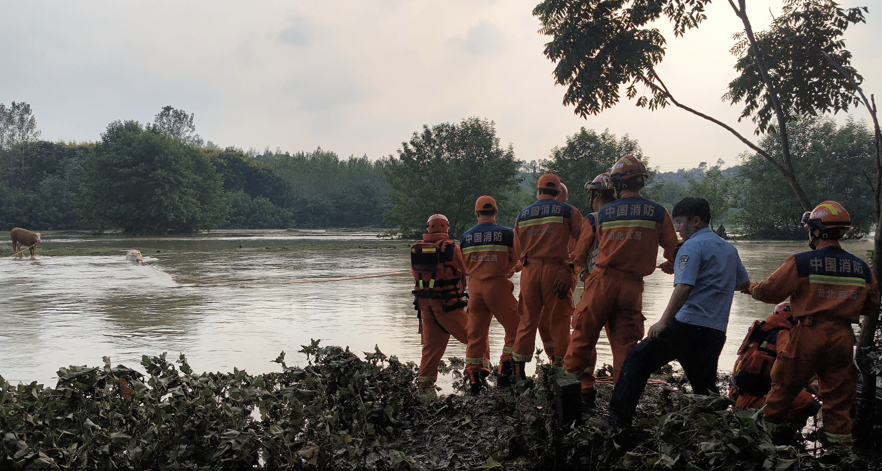 9月4日15时41分,枝江市消防救援大队接到群众求助电话,称董市镇玛瑙河附近,因强降雨导致水位上涨有牛被困河中孤岛,需要救援。枝江市消防救援大队立即调派友谊大道、姚家港两站共计3车19人前往处置,站级水域救援分队迅速响应,大队全勤指挥部随警出动,同时联动公安、应急、生态环境局等相关部门到场协同处置。