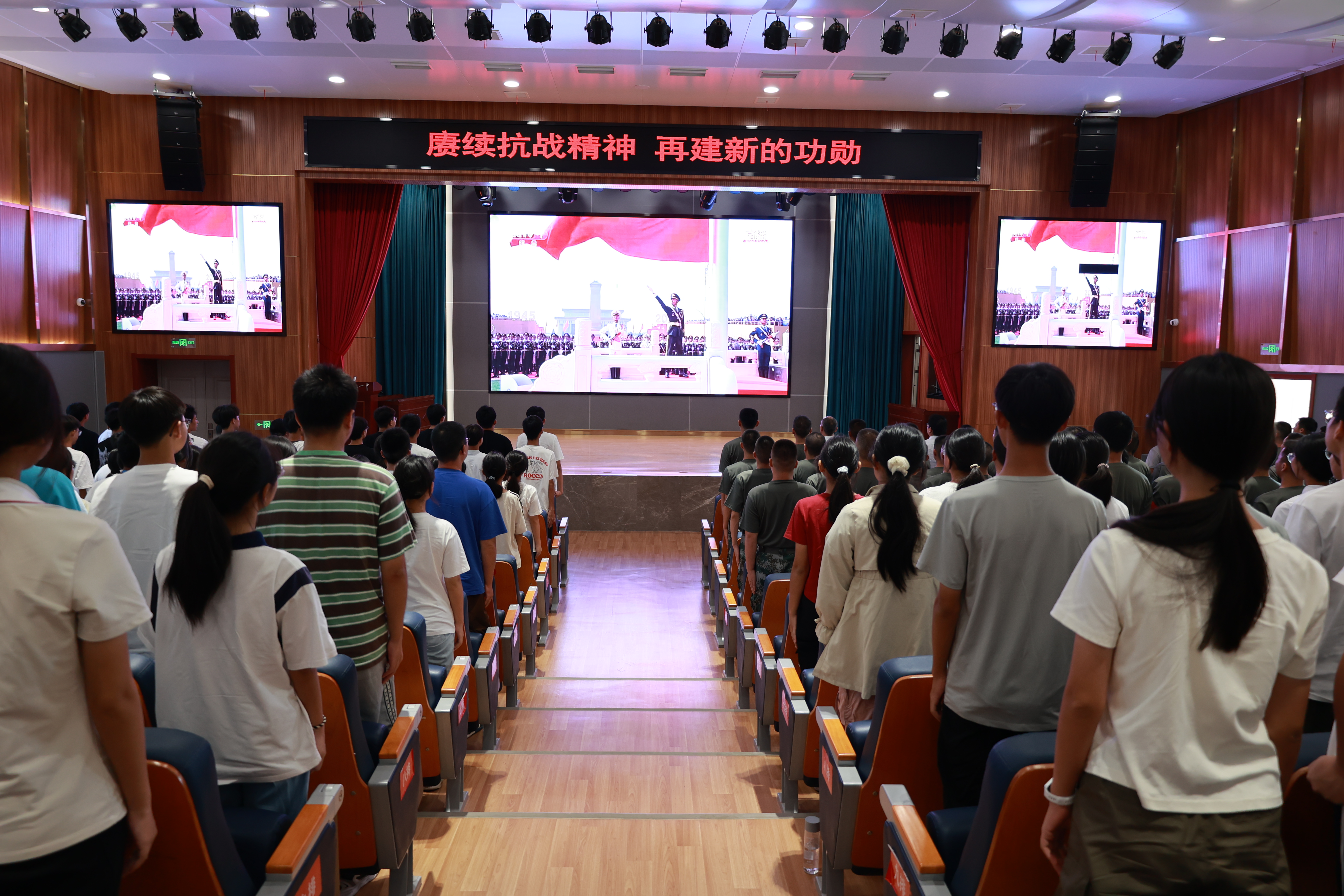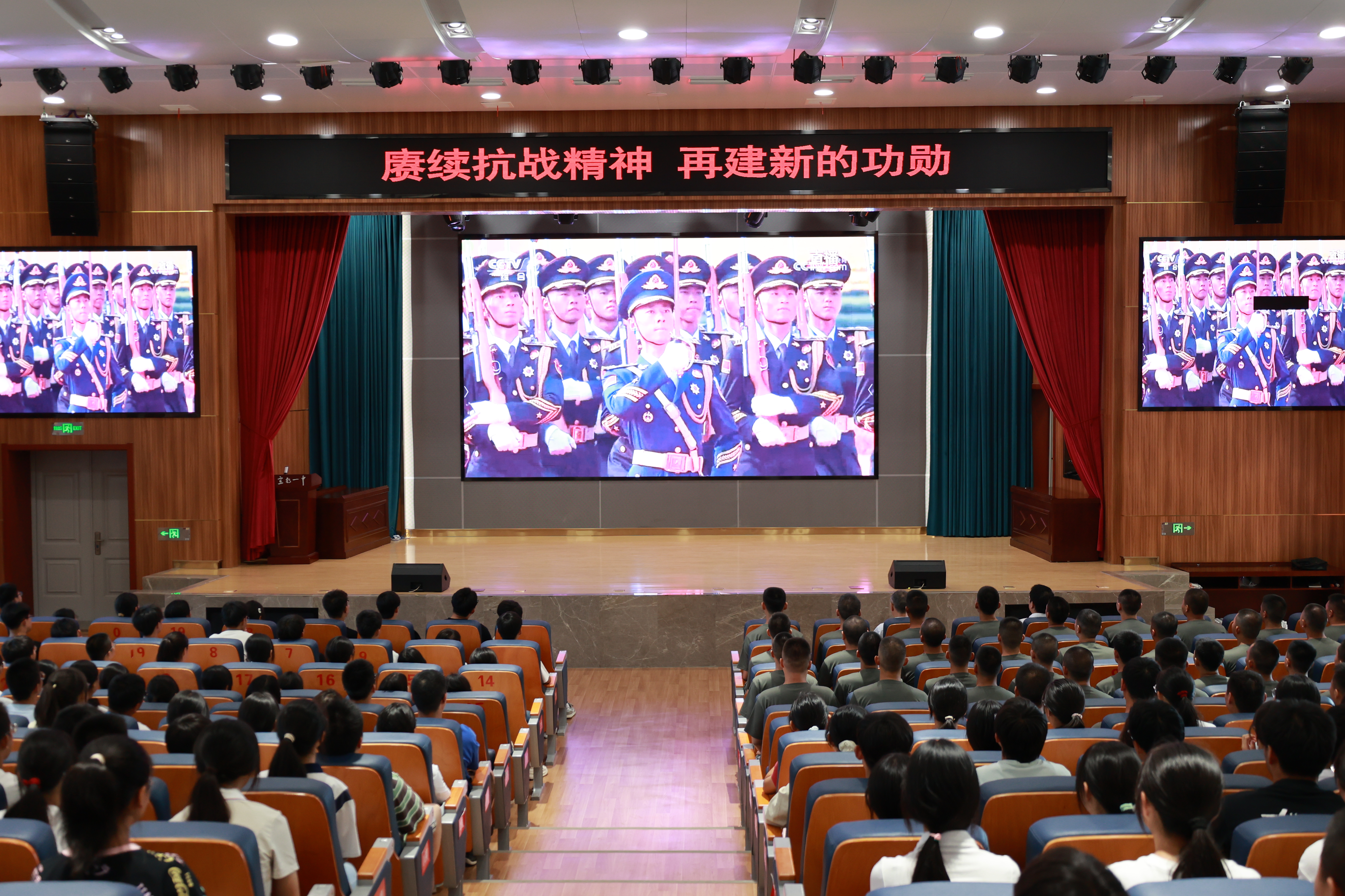 弘毅堂报告厅内全体师生坐姿端正,全神贯注地注视着屏幕,受阅官兵们步伐整齐划一,以昂扬的精神面貌接受祖国和人民的检阅,铿锵有力的脚步声踏在了每个人的心上,全体师生被眼前的盛大场面深深震撼。