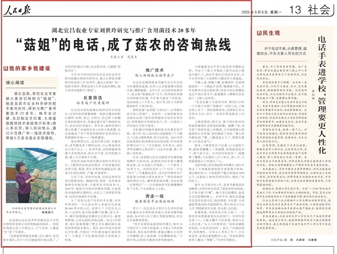 9月8日,《人民日报》刊发文章《“菇姐”的电话,成了菇农的咨询热线》报道了宜昌市农科院微生物所正高级农艺师刘世玲的工作事迹。