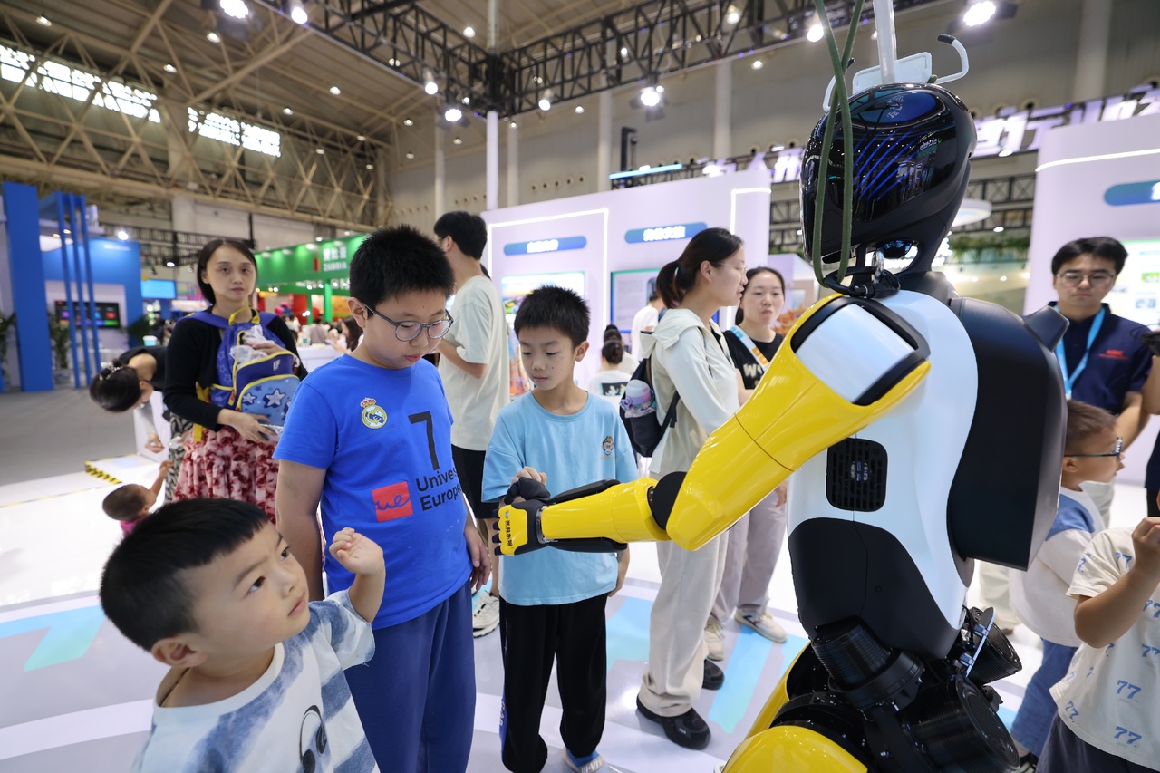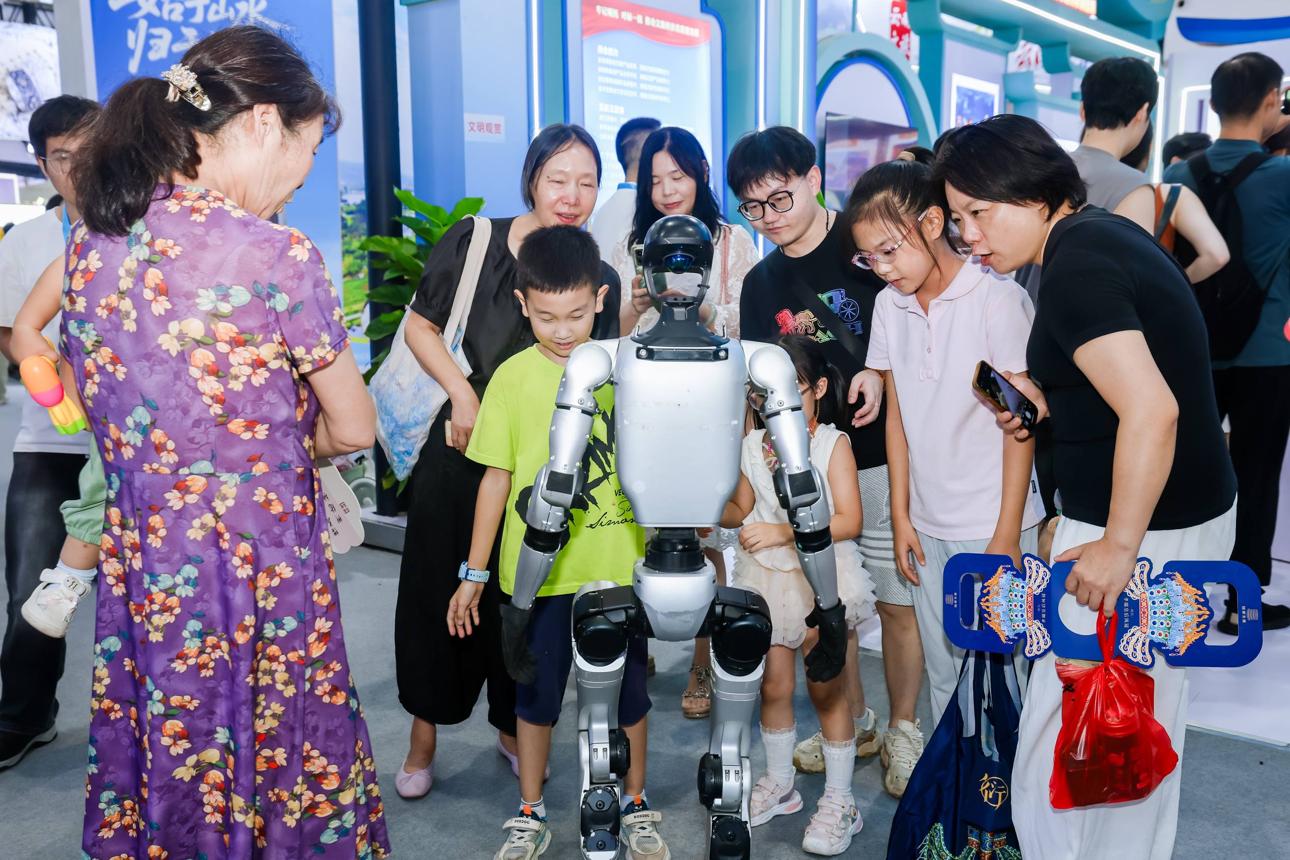 不远处,湖北文旅集团展出的家庭服务型机器人吸引了众多家庭的驻足关注。这款家庭机器人配备API与大模型功能,通过AI对话为用户提供情绪价值和情感交互。“我们的最终目标是让机器人走进家庭,成为家庭中的‘一分子’。”现场工作人员说。不少小朋友围在机器人身边好奇地提问:“你会讲故事吗?”“你能帮我写作业吗?”机器人风趣的回答引发了观众阵阵欢笑声。
