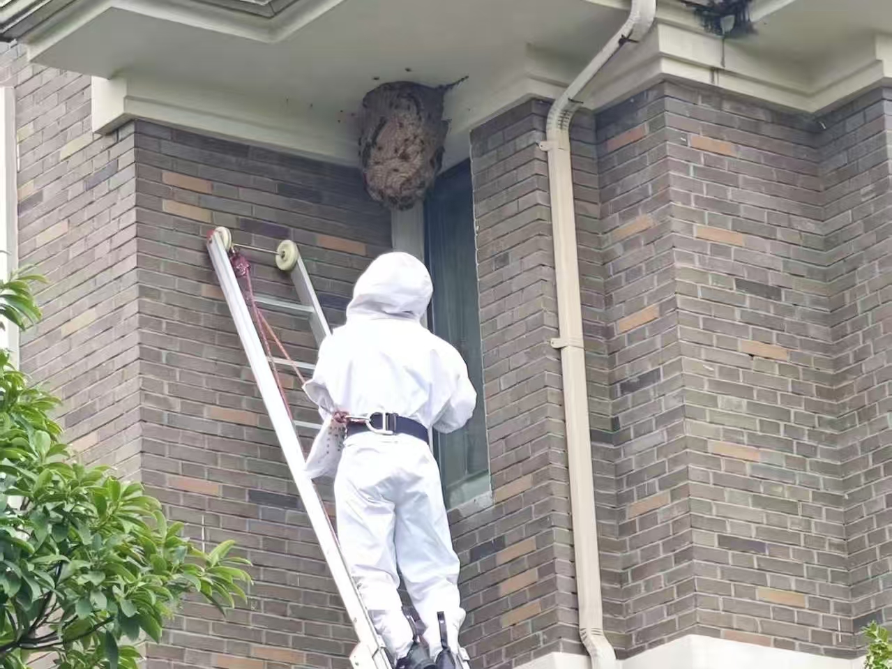 据了解,该小区3楼外墙处,近期悄然“长”出巨型马蜂窝,马蜂频繁活动致居民不敢靠近楼栋,物业自行处置未果后报警。消防员勘察发现,马蜂窝附着的外墙区域空间狭窄,且楼下常有居民往来,遂制定“先消杀、后摘除”的方案,同步疏散周边群众、提醒附近住户关闭窗户。做好预防措施后,一名消防员身着防蜂服、系好安全绳,沿梯子攀爬至马蜂窝旁,先对巢穴喷洒杀虫剂。待马蜂失去活力后,将其从外墙剥离并装入密封袋带离。