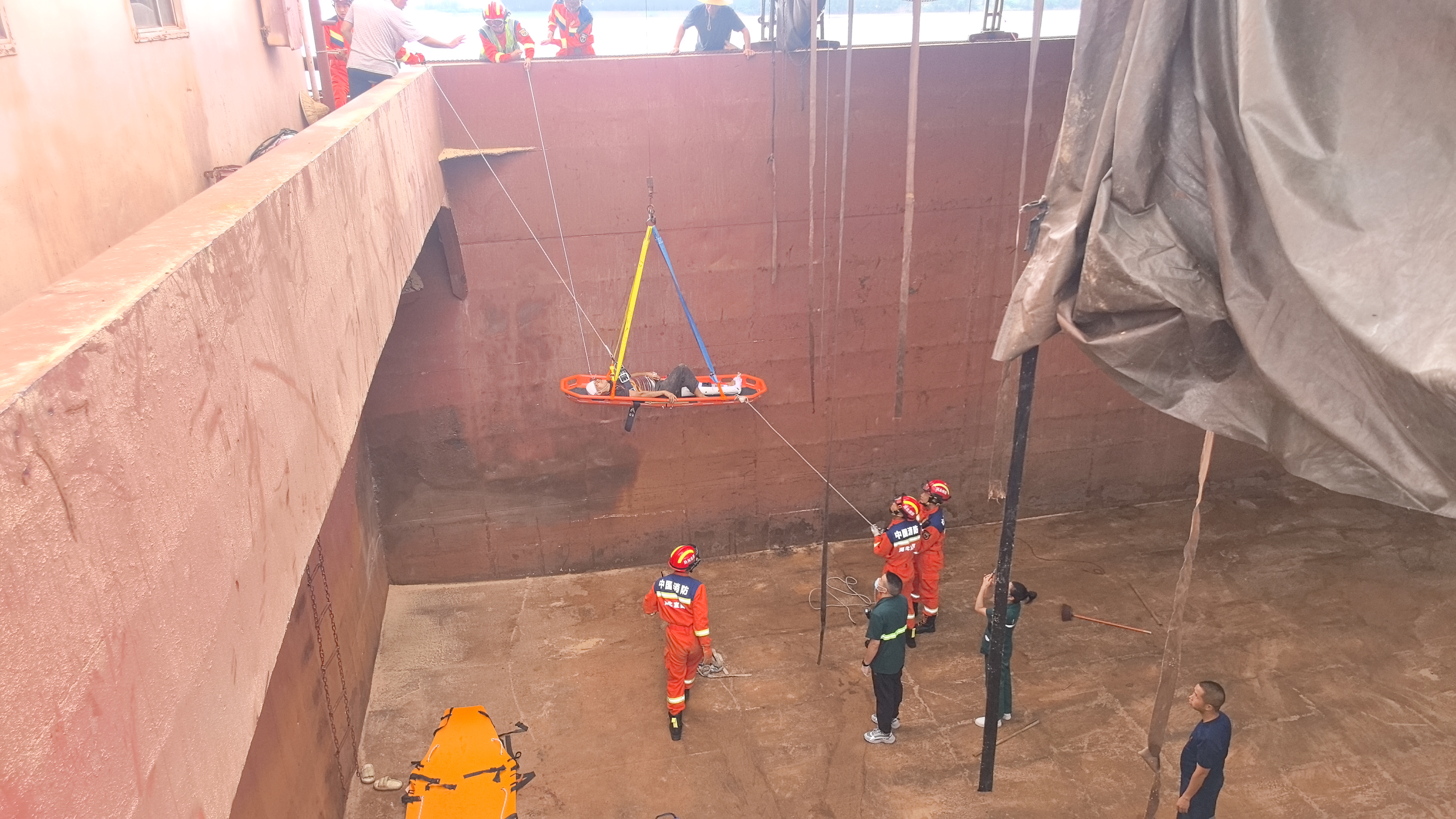 经现场侦查,被困人员坠落至船舱底部甲板导致小腿骨折,但生命体征正常。现场指挥员立即下达救援指令,医疗组协同现场医护人员对被困人员骨折部位进行固定;救生组使用拉梯、救援担架、绳索等器材开展组合救援,警戒组协同公安部门对现场实行管控,安全员开展风险评估,并持续进行安全监测。经过近40分钟紧张处置,于13时42分将被困人员成功救出并移交现场医护人员。目前,事故原因在进一步调查中。