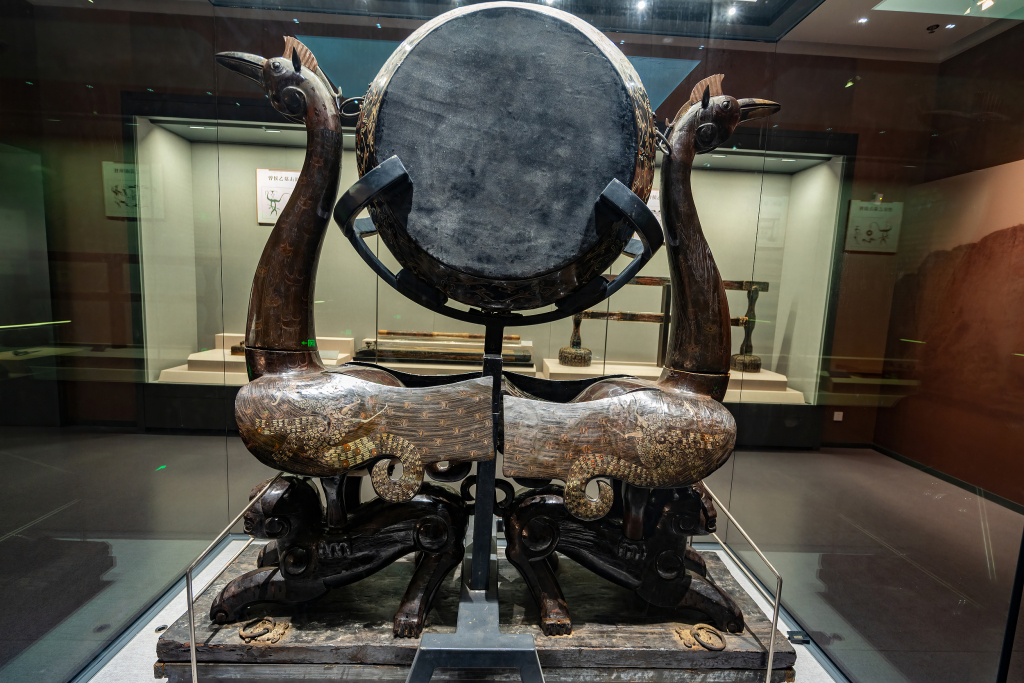 荆州博物馆展出的虎座凤鸟悬鼓。视觉中国 图