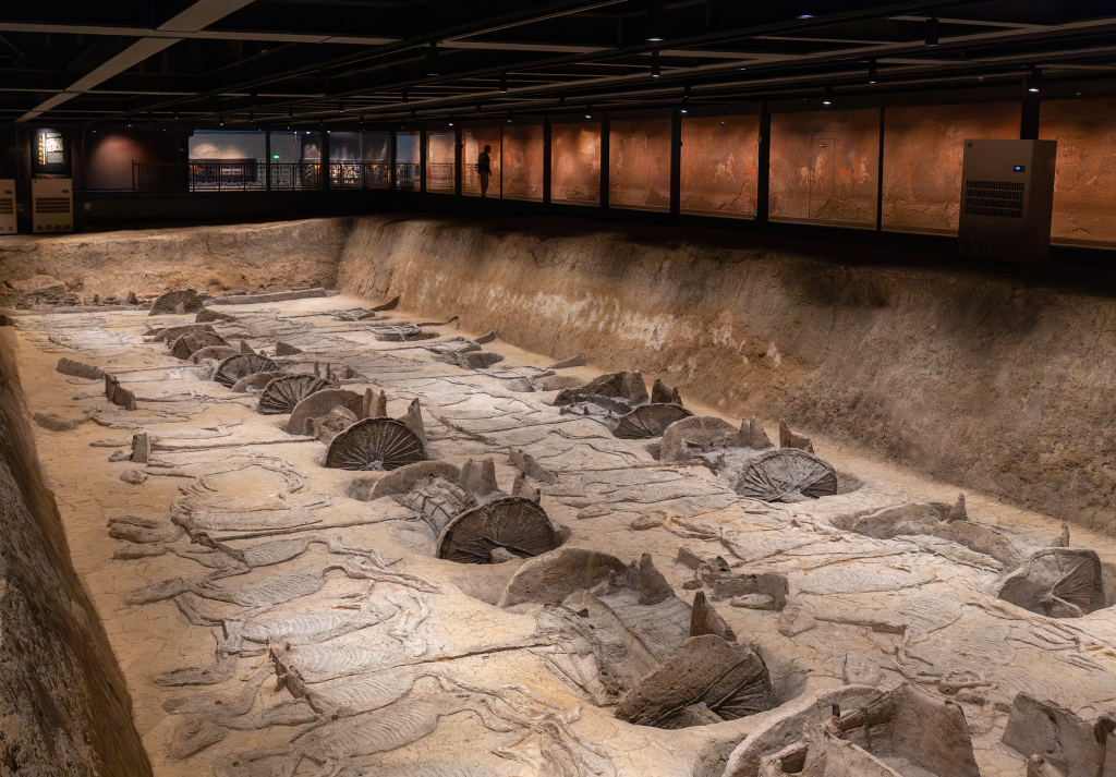 132米长的一号车马坑内,43辆战车、164匹战马遗骸分列两排,这些车马并非陶土所塑,而是真实的木质战车与骏马遗存,虽历经两千余年,车辕、轮毂、马骨的形态仍清晰可辨。