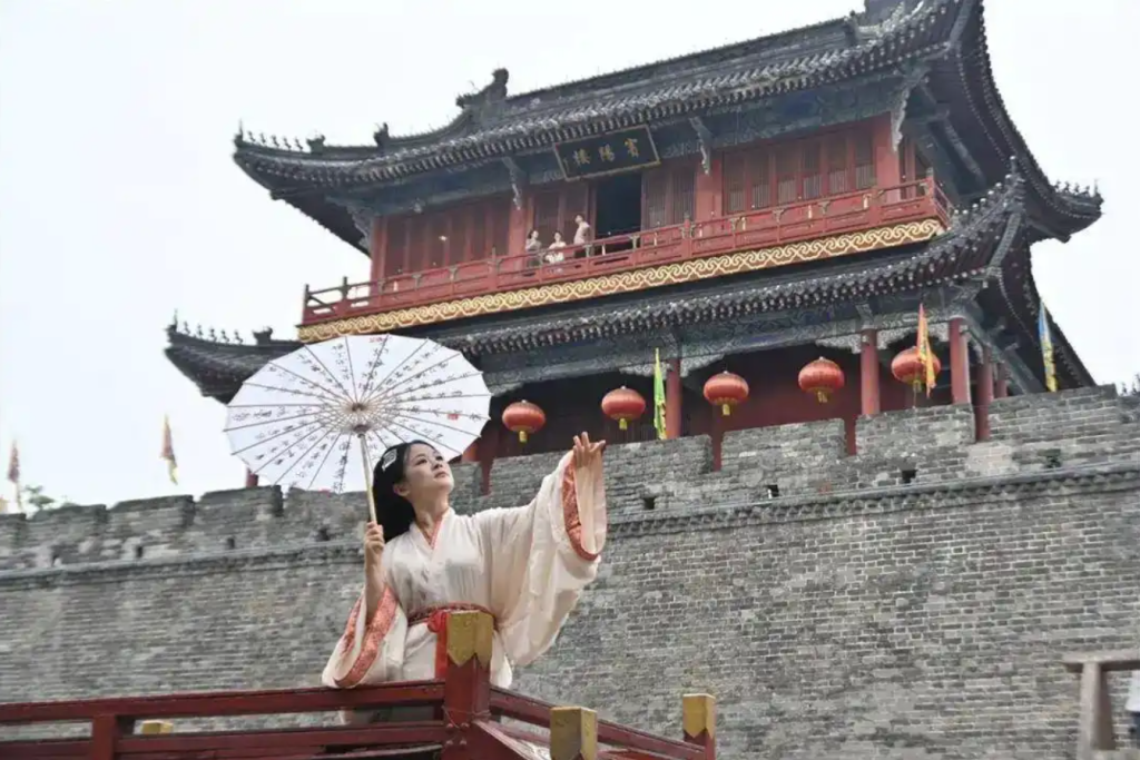 游客在荆州古城宾阳楼拍摄战国袍照片。湖北日报记者 何辉 通讯员 易静雯 摄