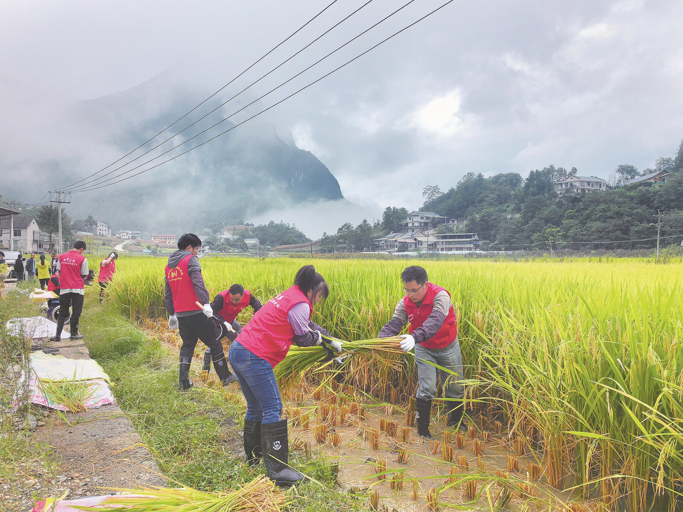 图为志愿者们正和村民们一起收割稻穗。 (通讯员彭仲爱 摄)