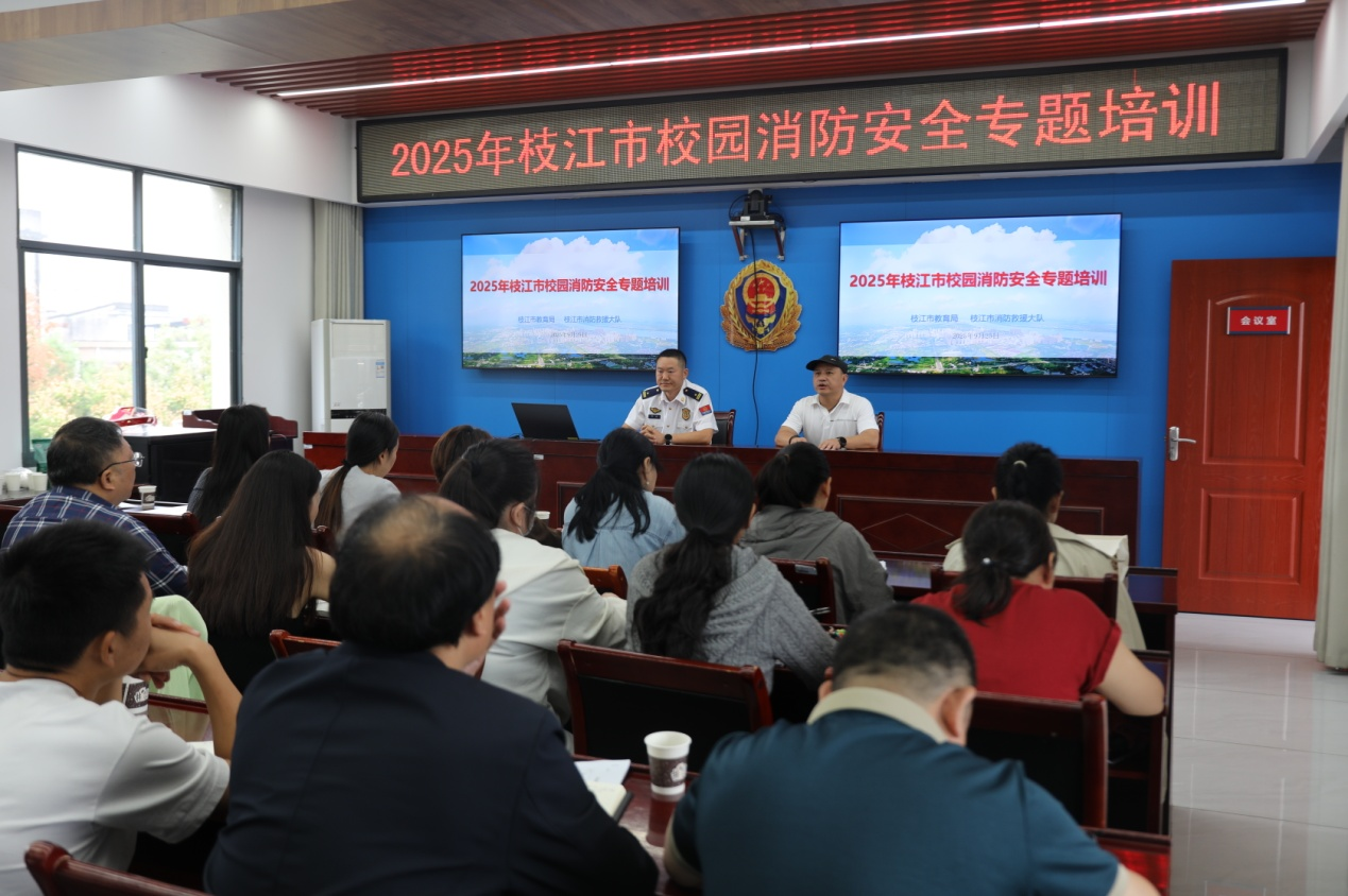 9月25日,枝江市消防救援大队联合市教育局,组织全市学区办、中小学、幼儿园分管负责人共计69人集中开展校园消防安全专题培训。