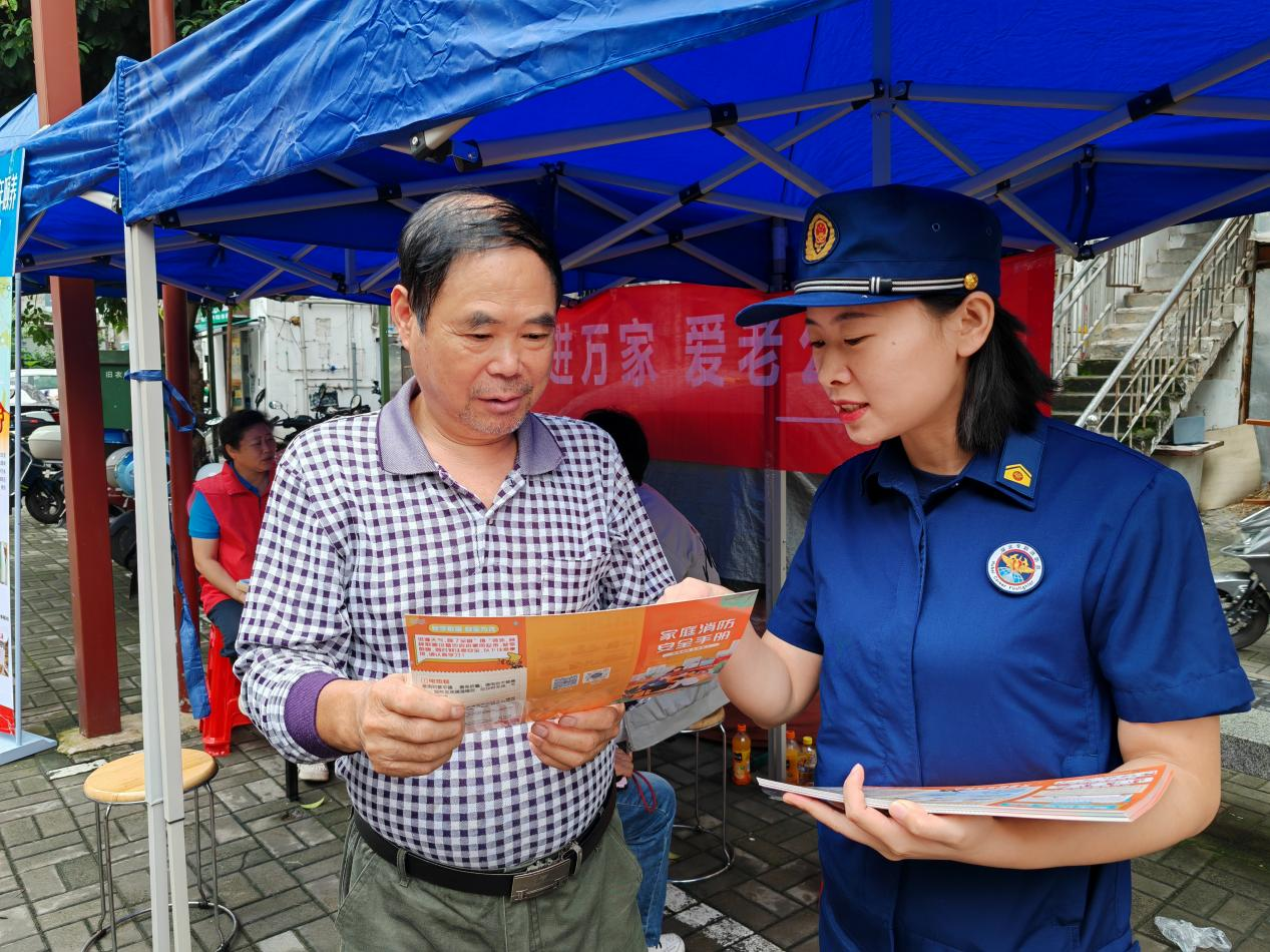 宣讲结束后,互动问答环节随即展开。“油锅起火该用什么灭火?”“怎样正确地报火警?”消防员抛出问题,居民们踊跃举手,答对者当场获消防主题雨伞、围裙等礼品,现场掌声不断。同时,工作人员在台下向居民发放消防宣传单页,补充讲解细节,确保知识覆盖全面。