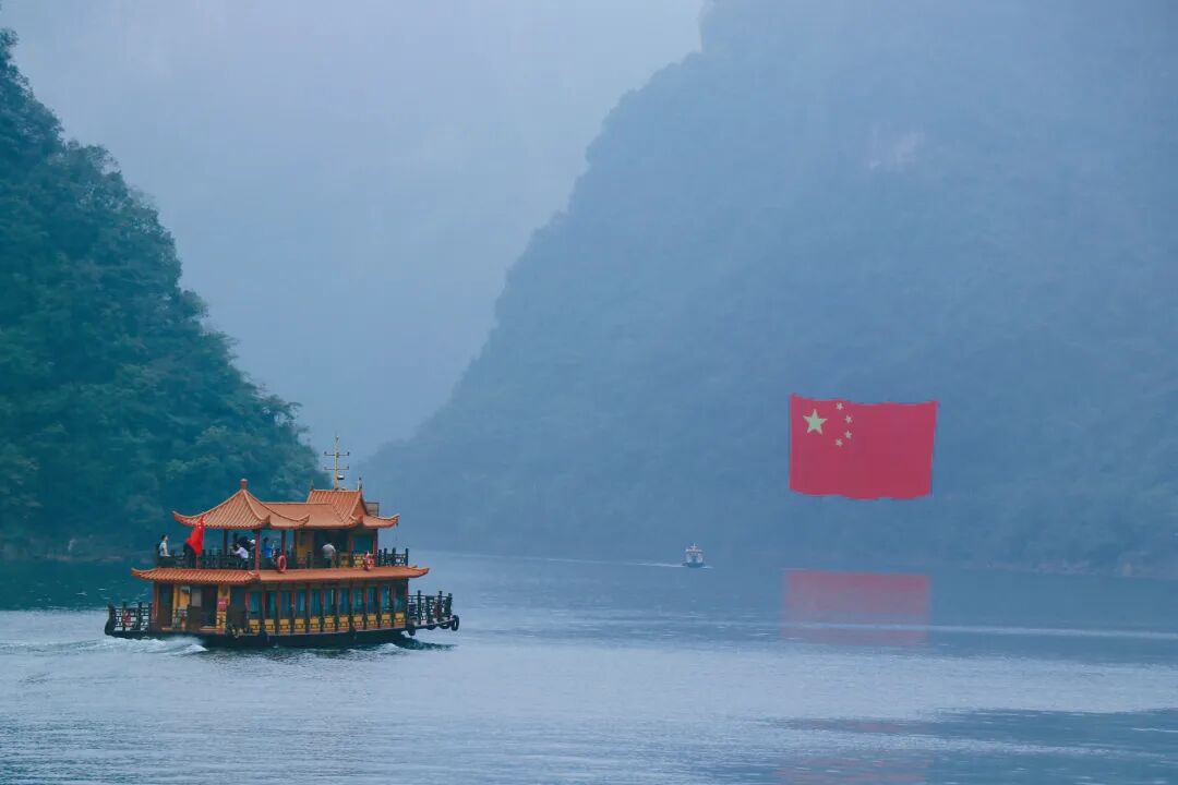 倒影峡畔,巨幅国旗经雨水冲刷后红得耀眼