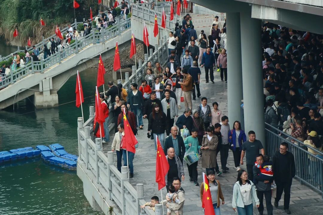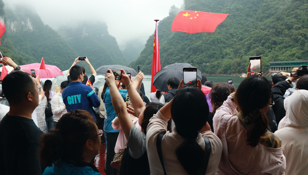 景区通过巨幅国旗在山水间舒展、