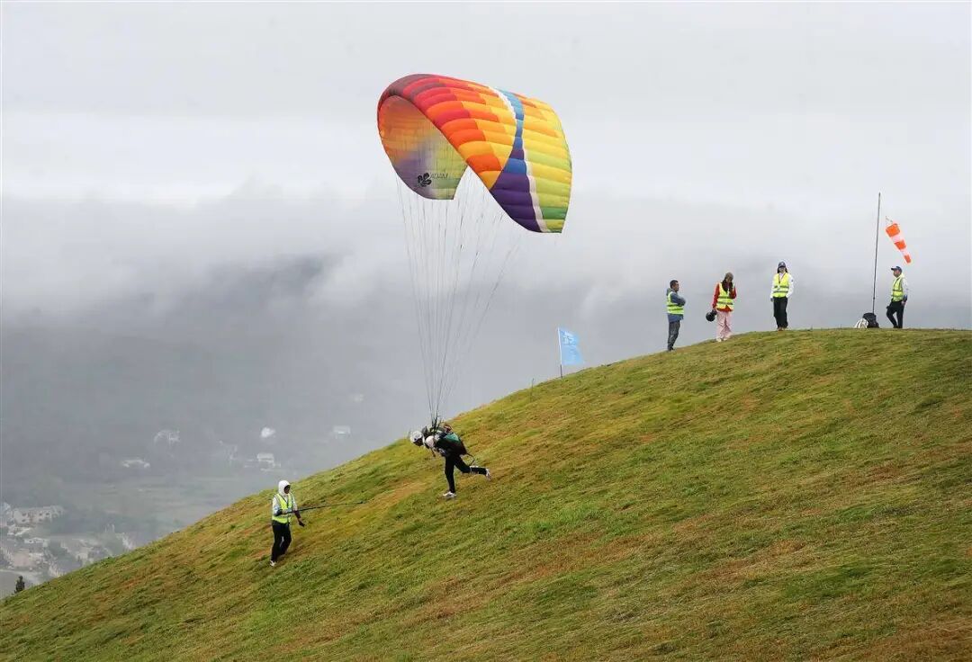 2025年滑翔伞定点世界杯总决赛的参赛选手拉伞起飞。