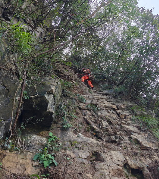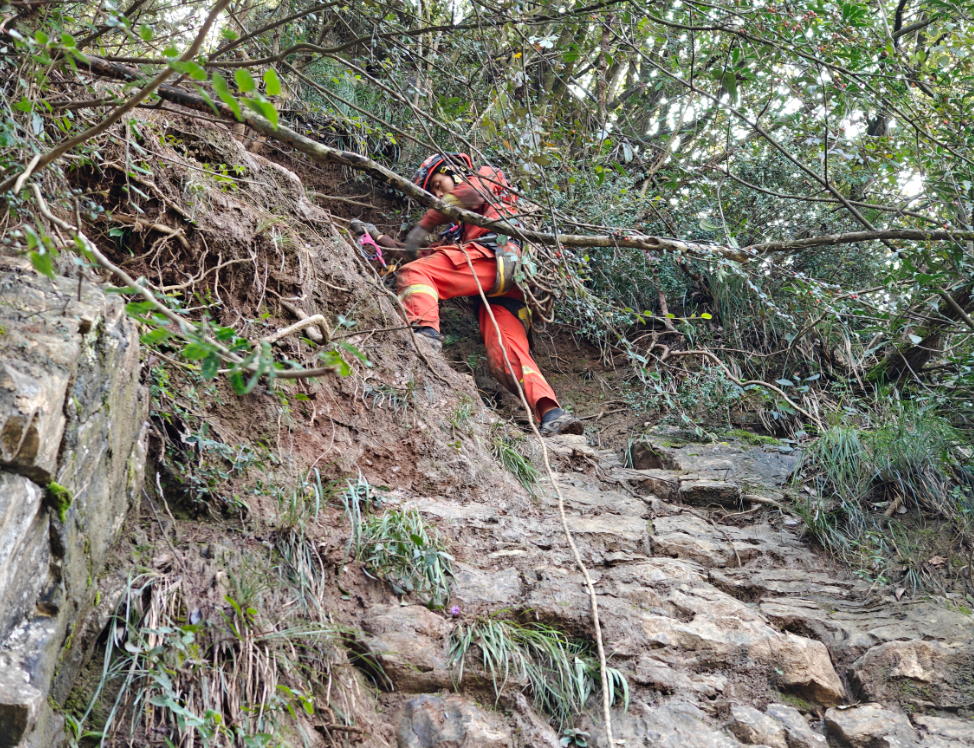 途中,一名男子因虚脱陷入昏迷无法行走,由于男子体重较重,山路崎岖,脚下是300多米的悬崖,再加上山中持续降雨,山路湿滑,转移难度较大。大队随即派出4人前往增援。次日凌晨4时增援人员到达,经过简单处理后,利用多功能担架将昏迷人员固定后,运用山岳绳索救援装备搭建倍力救援系统,利用扁担缠绕多个粗壮树木,制作两个自然锚点,采取向上提拉的方式,将被困人员转移至安全区域。
