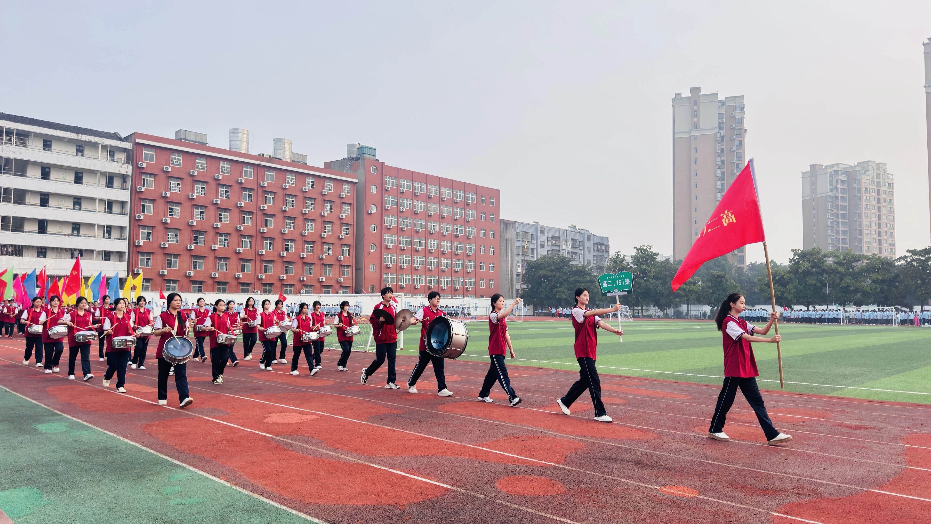 开幕式伊始,各方阵代表队精神抖擞、步伐整齐地依次入场,一群挺拔如松的二高学子们,他们迈着轻快而有力的步伐,或手持各色花环花束,或高擎各种特色道具,恰似流动的彩虹漫过红色跑道,青春气息与秋日暖阳交织辉映,灿烂耀眼。